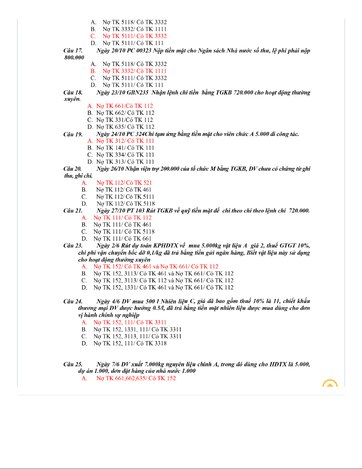 Nợ TK 112/ Có TK 5118 C. Nợ TK 112/ Có TK 3311 D. Nợ TK 112/ Có TK 3118 Câu 16.