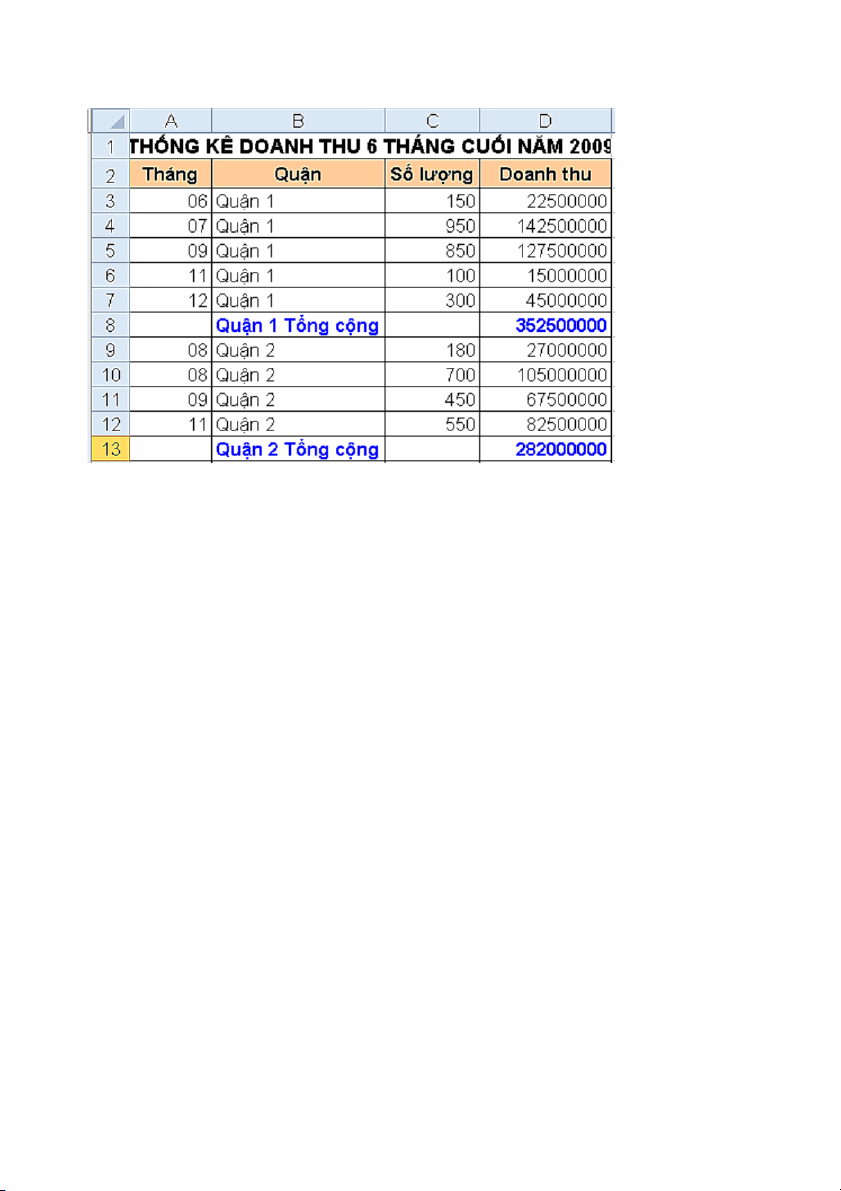 thứ tự tăng dần của trường đó và tính toán một số liệu nào đó cho mỗi nhóm ta dùng lệnh: A. Data - Sort B. Data - Subtotal C. Data - Consolidate D. Tất cả sai