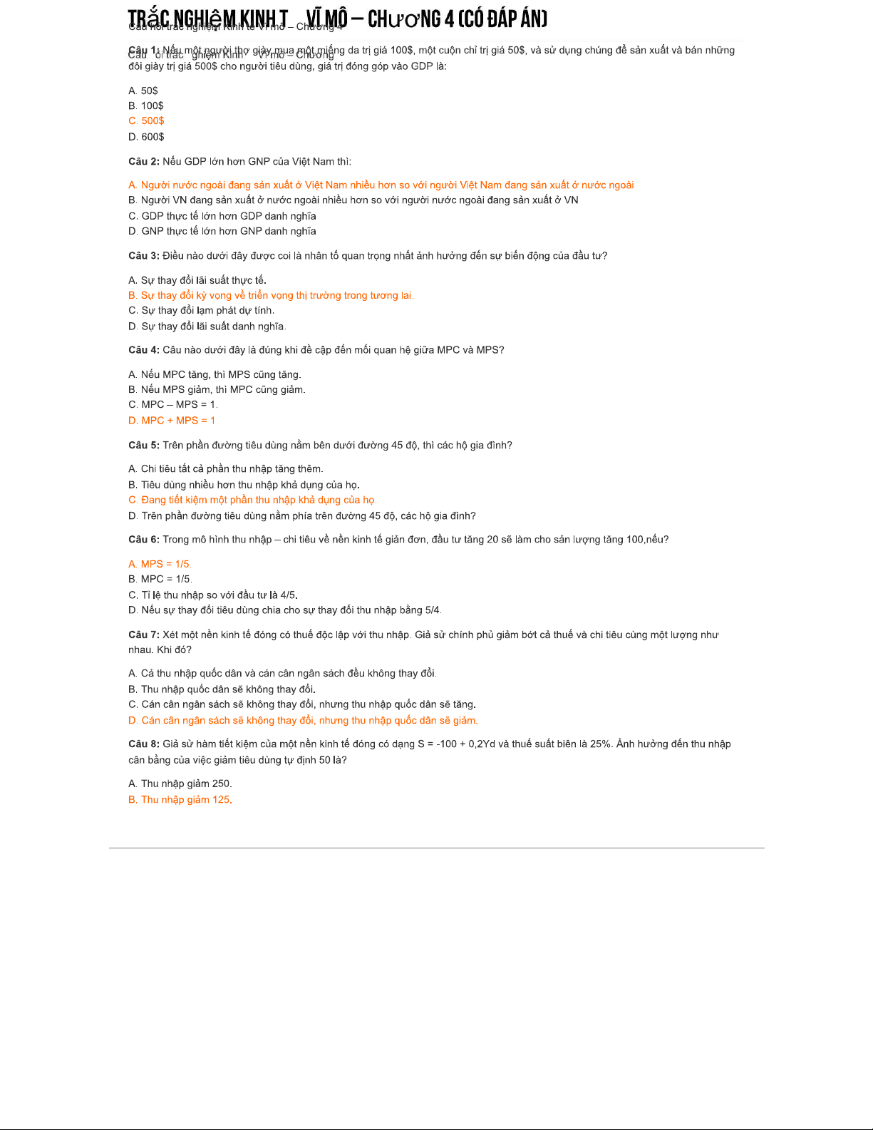 Trắc nghiệm Kinh tế Vĩ mô - Chương 4 (Có đáp án) và Phân tích câu hỏi