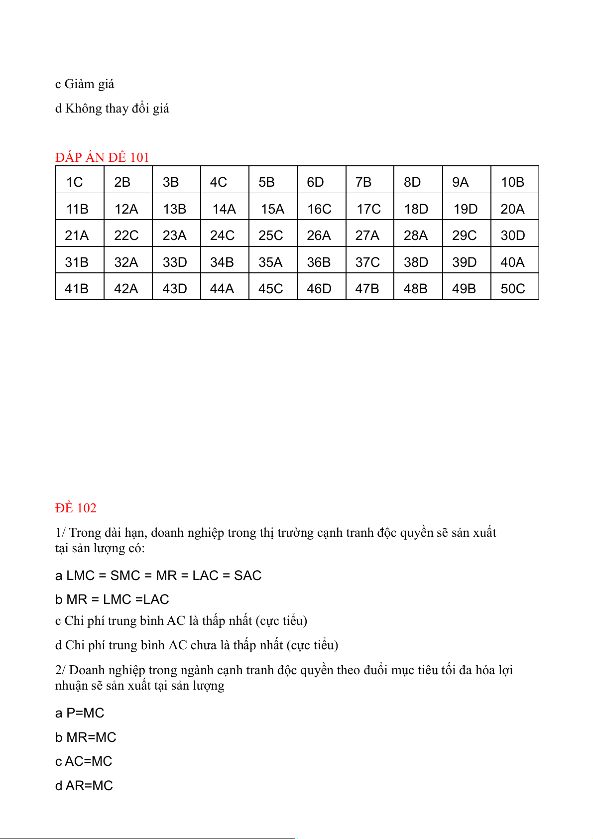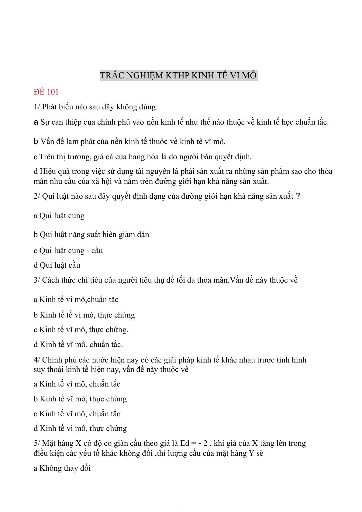 TRẮC NGHIỆM KTHP KINH TẾ VI MÔ ĐỀ 101