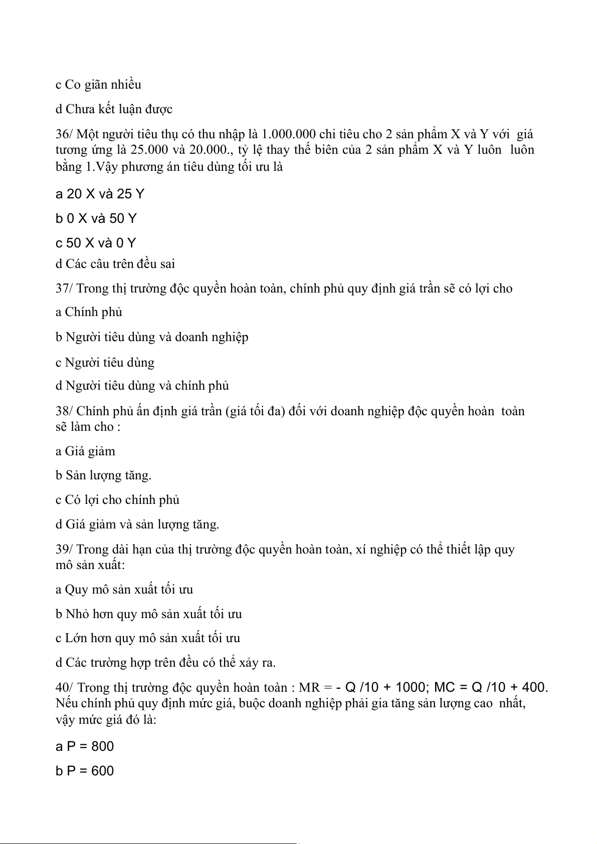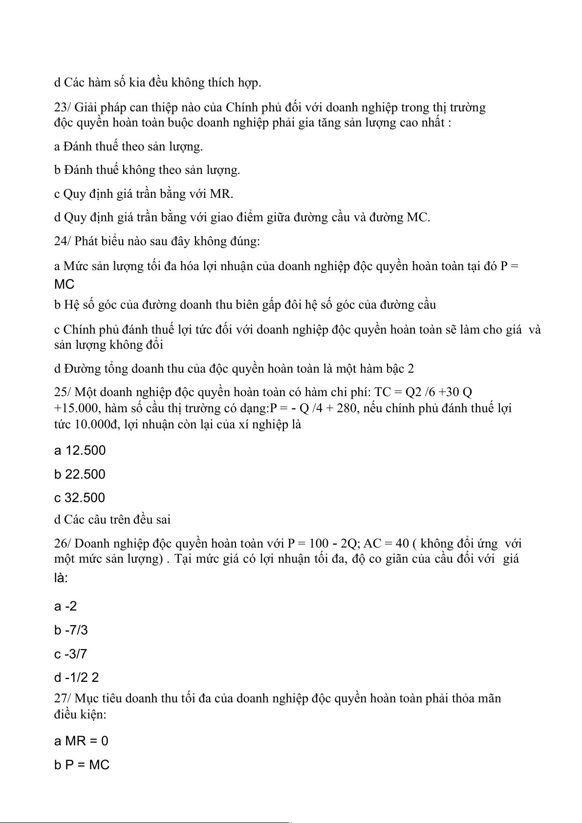 27/ Mục tiêu doanh thu tối đa của doanh nghiệp độc quyền hoàn toàn phải thỏa mãn điều kiện: a MR = 0 b P = MC c TR = TC d MR = MC