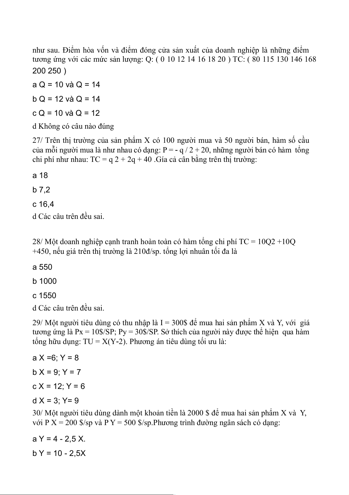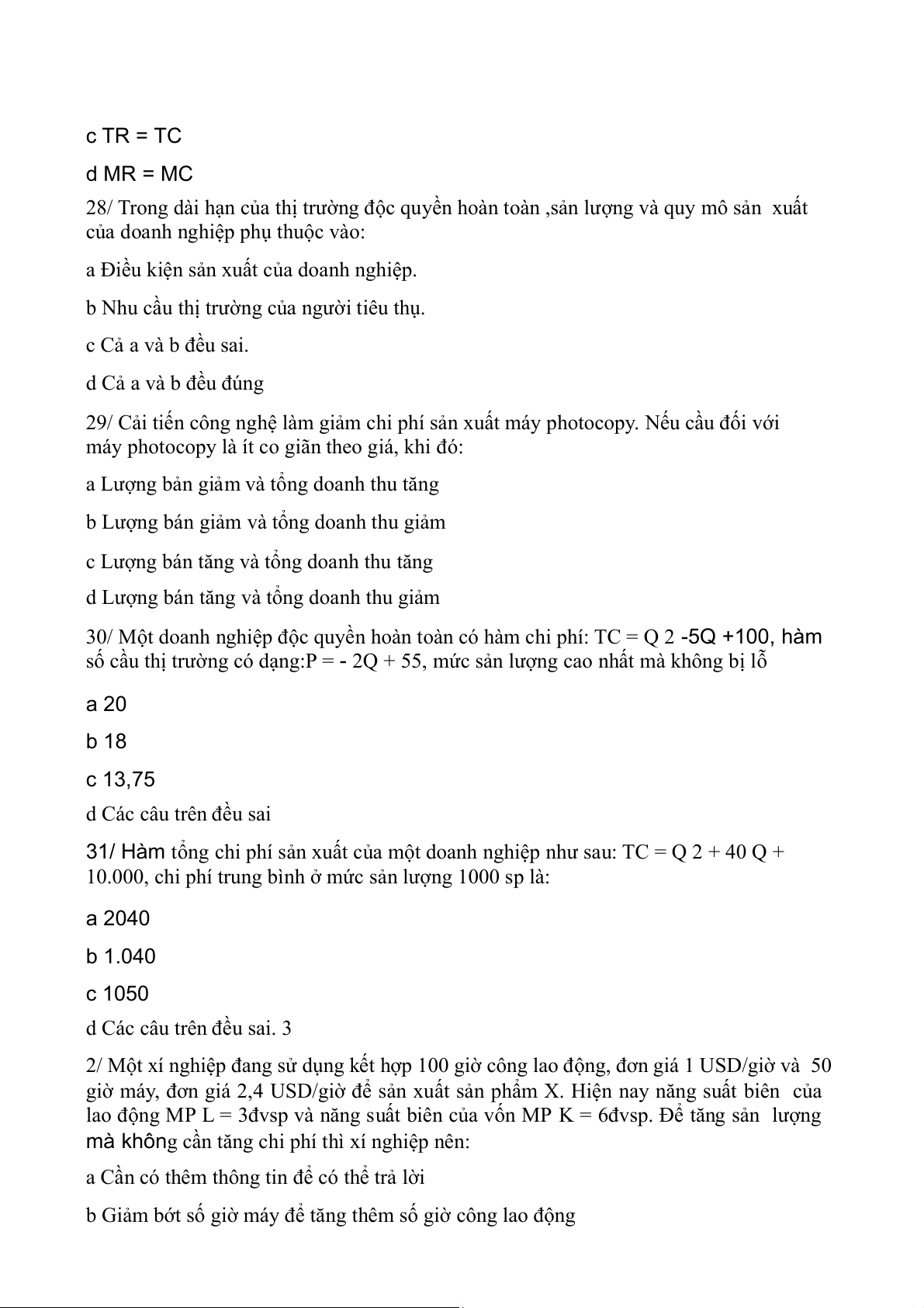 25/ Một doanh nghiệp độc quyền hoàn toàn có hàm chi phí: TC = Q2 /6 +30 Q
