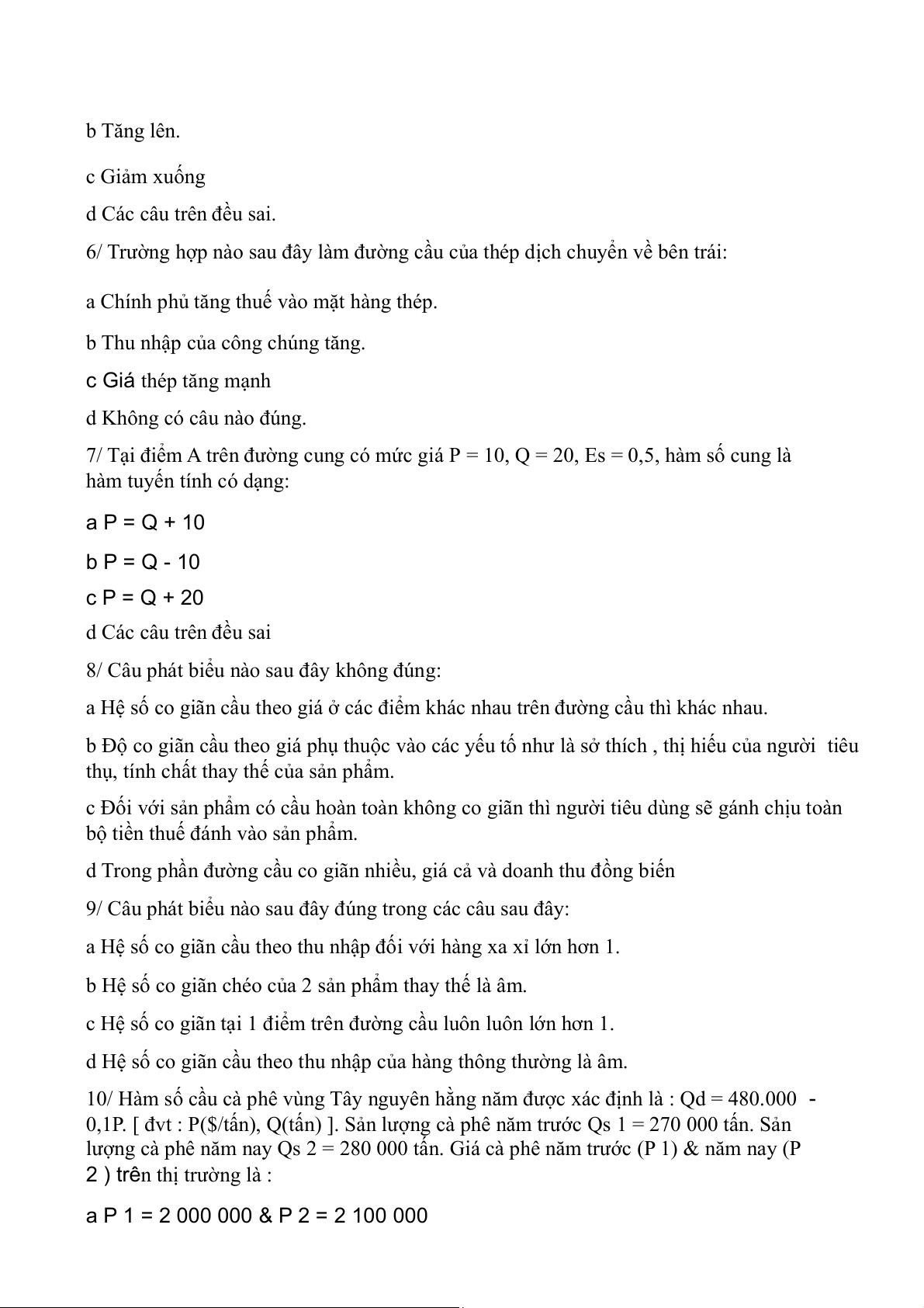 10/ Hàm số cầu cà phê vùng Tây nguyên hằng năm được xác định là : Qd = 480.000 -