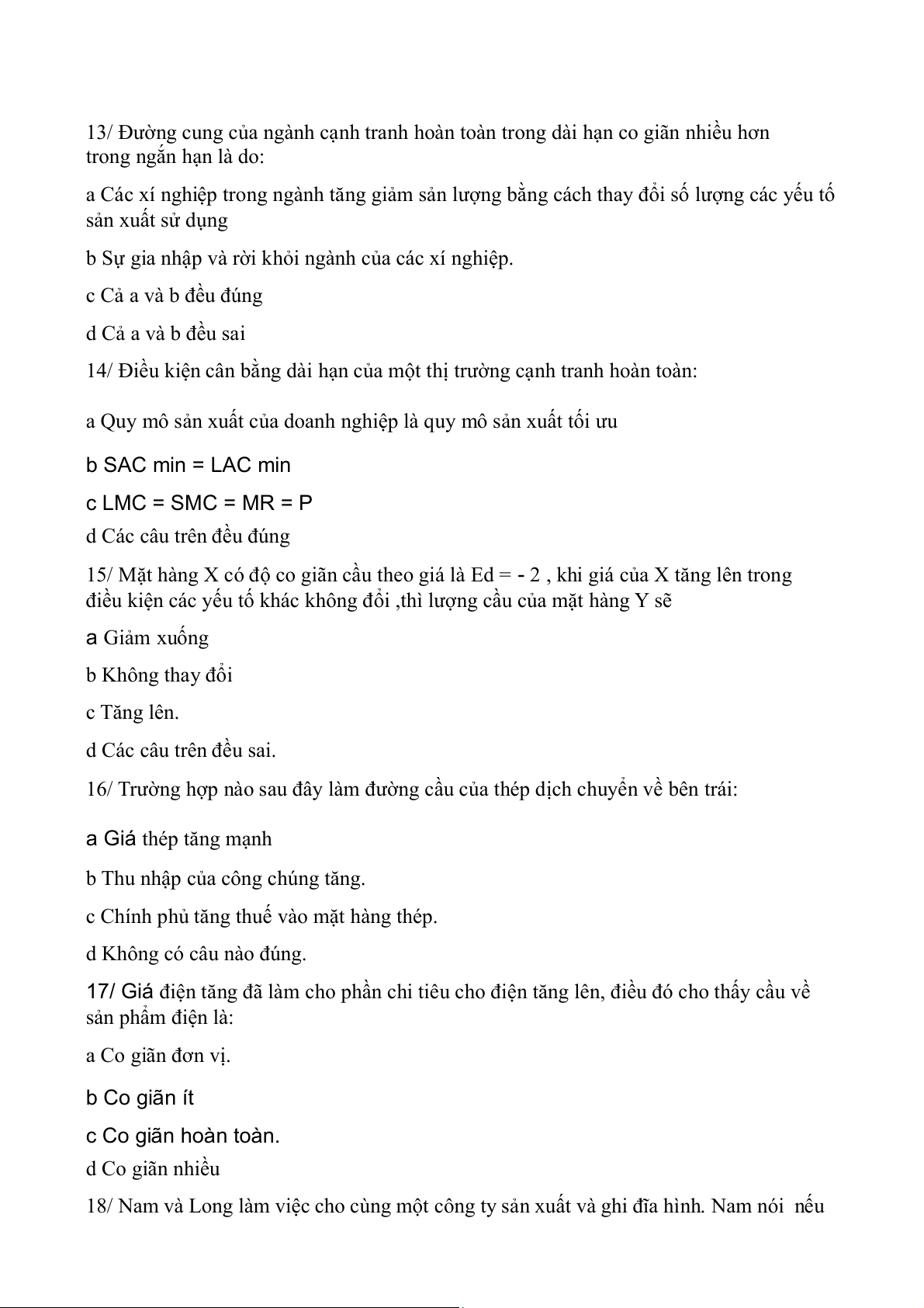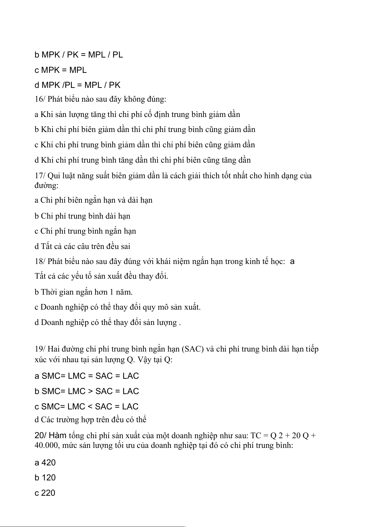 18/ Phát biểu nào sau đây đúng với khái niệm ngắn hạn trong kinh tế học: a
