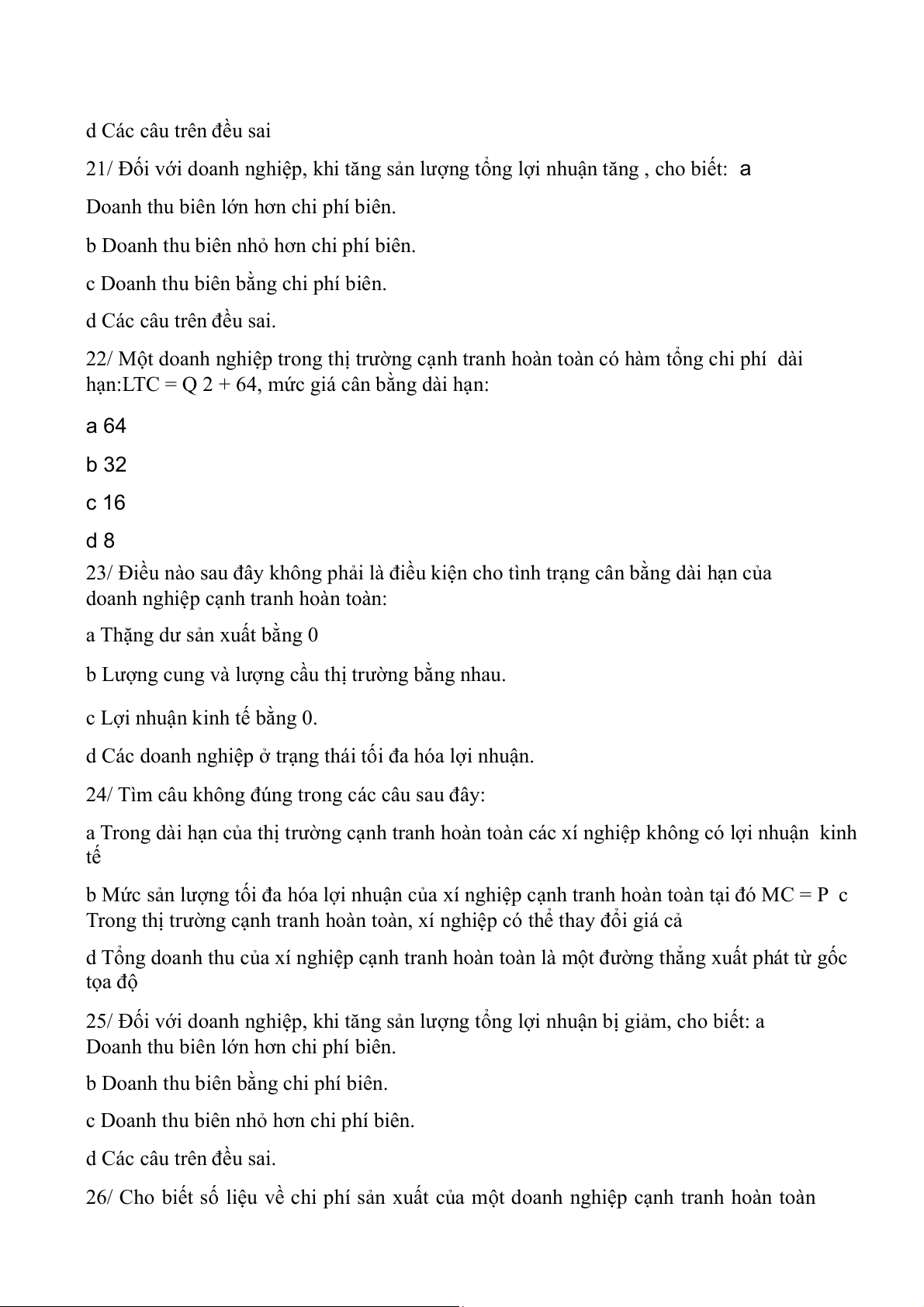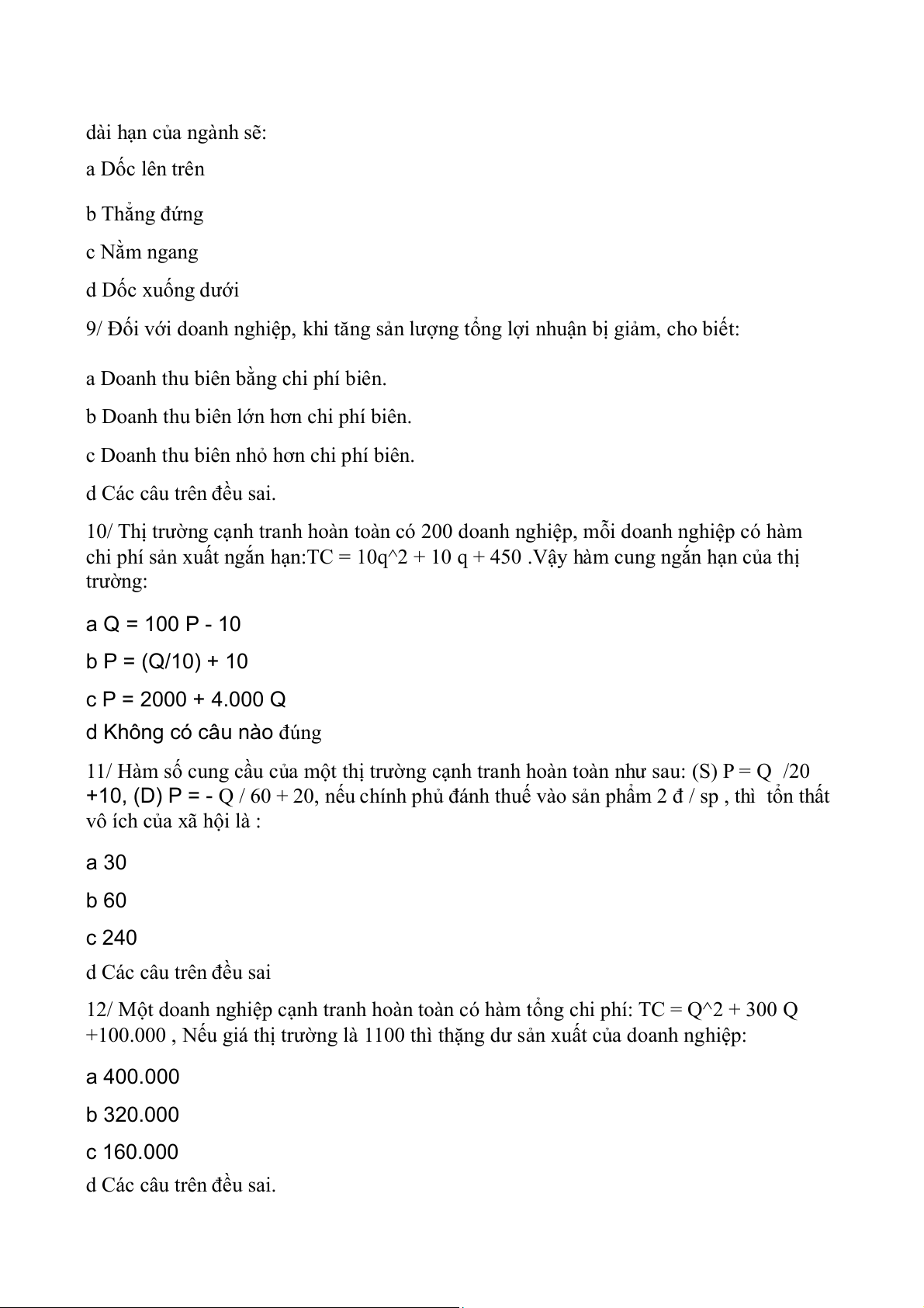 22/ Một doanh nghiệp trong thị trường cạnh tranh hoàn toàn có hàm tổng chi phí dài