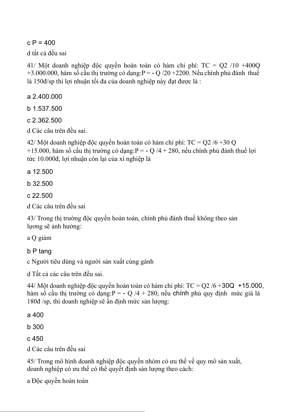 c Chính phủ đánh thuế lợi tức đối với doanh nghiệp độc quyền hoàn toàn sẽ làm cho giá và sản lượng không đổi
