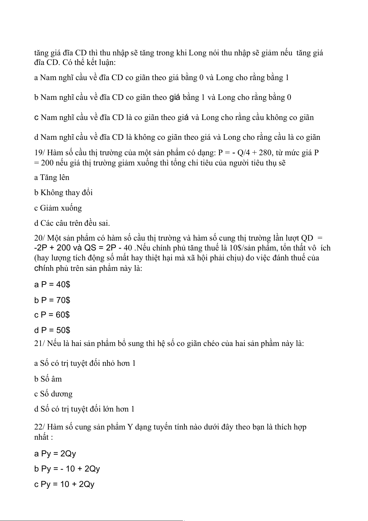 hàm tuyến tính có dạng: a P = Q + 10 b P = Q - 10 c P = Q + 20 d Các câu trên đều sai
