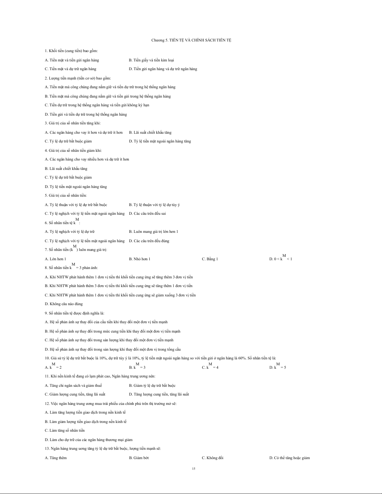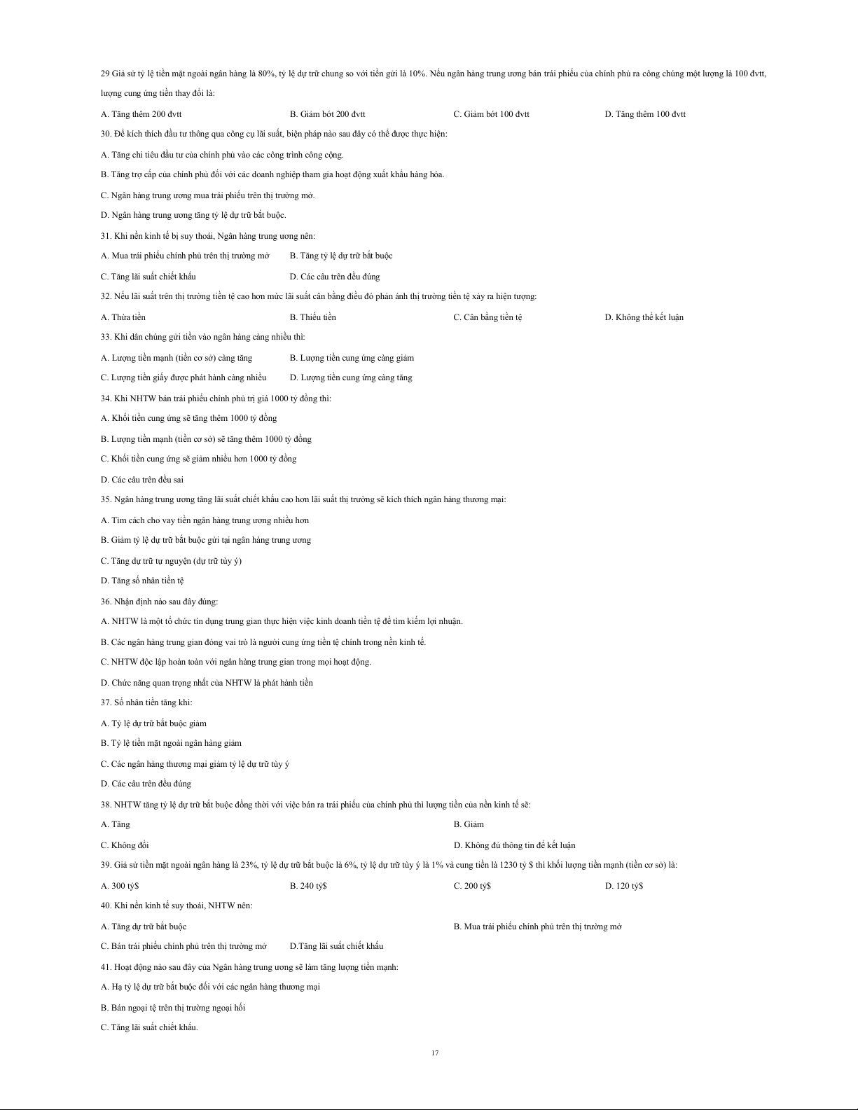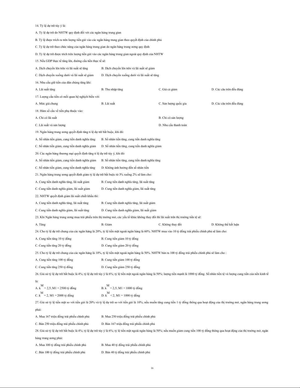 14. Khi NHTW giảm lệ dự trữ bắt buộc sẽ làm cho