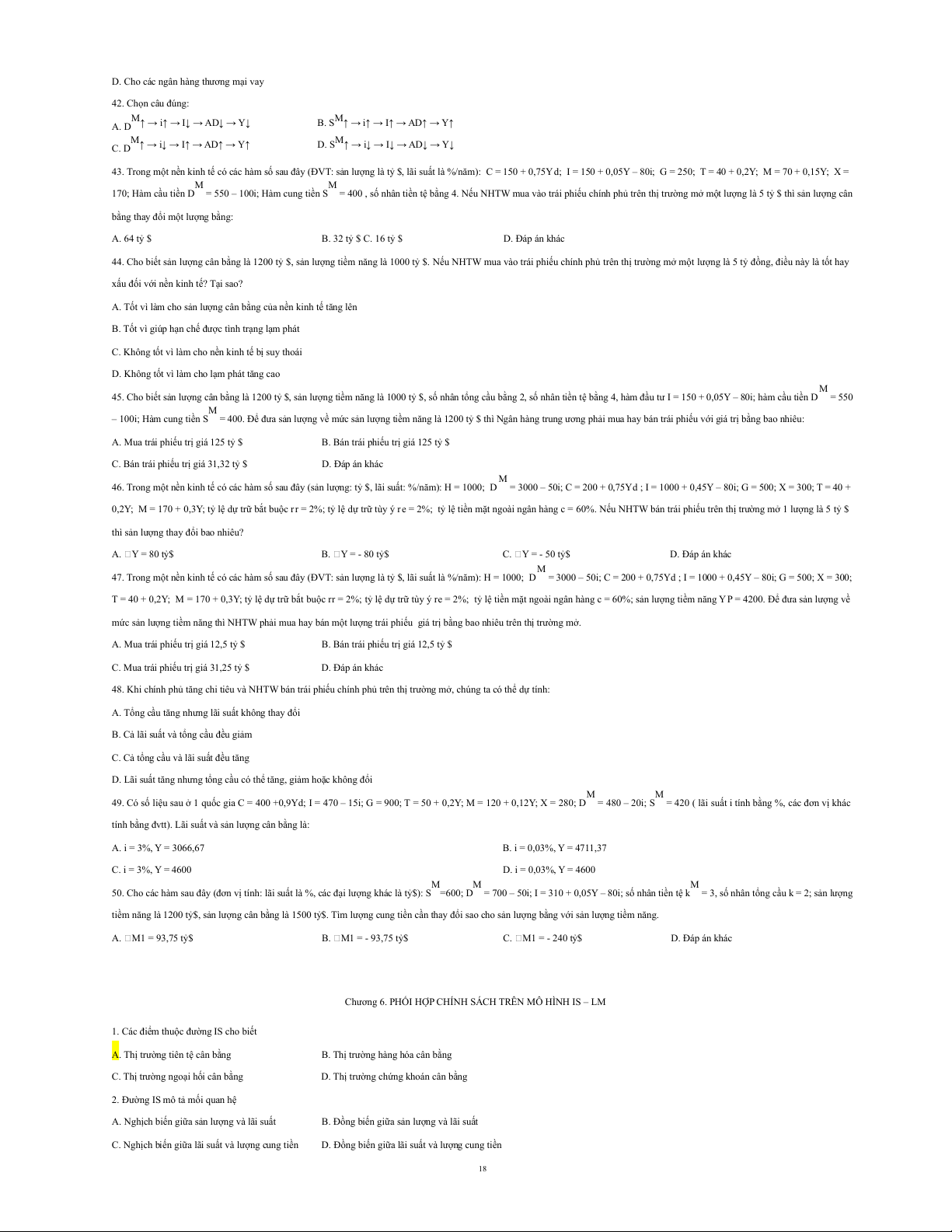 15. Giả sử nền kinh tế của 1 quốc gia có các hàm số sau C = 100 + 0,8Yd; I = 50 – 20i; T = 100 + 0,25Y; G = 280; X = 250; M = 100 + 0,1Y. (i là lãi suất, đvt:%). Phương trình của đường IS là A. Y = 2000 – 20i B. Y = 1000 – 20i C. Y = 1000 – 40i D. Đáp án khác M