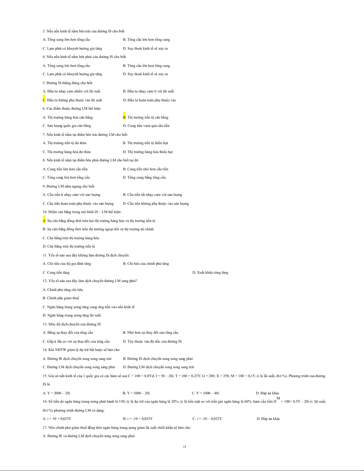 đvt:%) phương trình đường LM có dạng: A. i = 10 + 0,025Y B. i = -10 + 0,025Y C. i = -10 – 0,025Y D. Đáp án khác