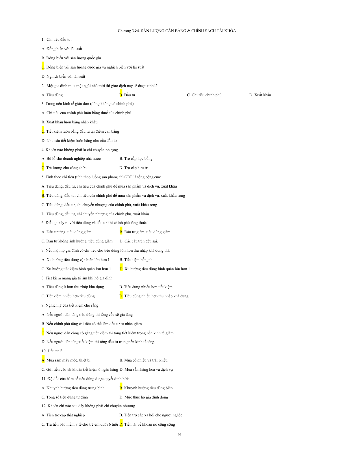 10. Biến số nào sau đây có thể thay đổi không gây ra sự dịch chuyển của đường tổng cầu: A. Mức giá B. Lãi suất C. Thuế suất