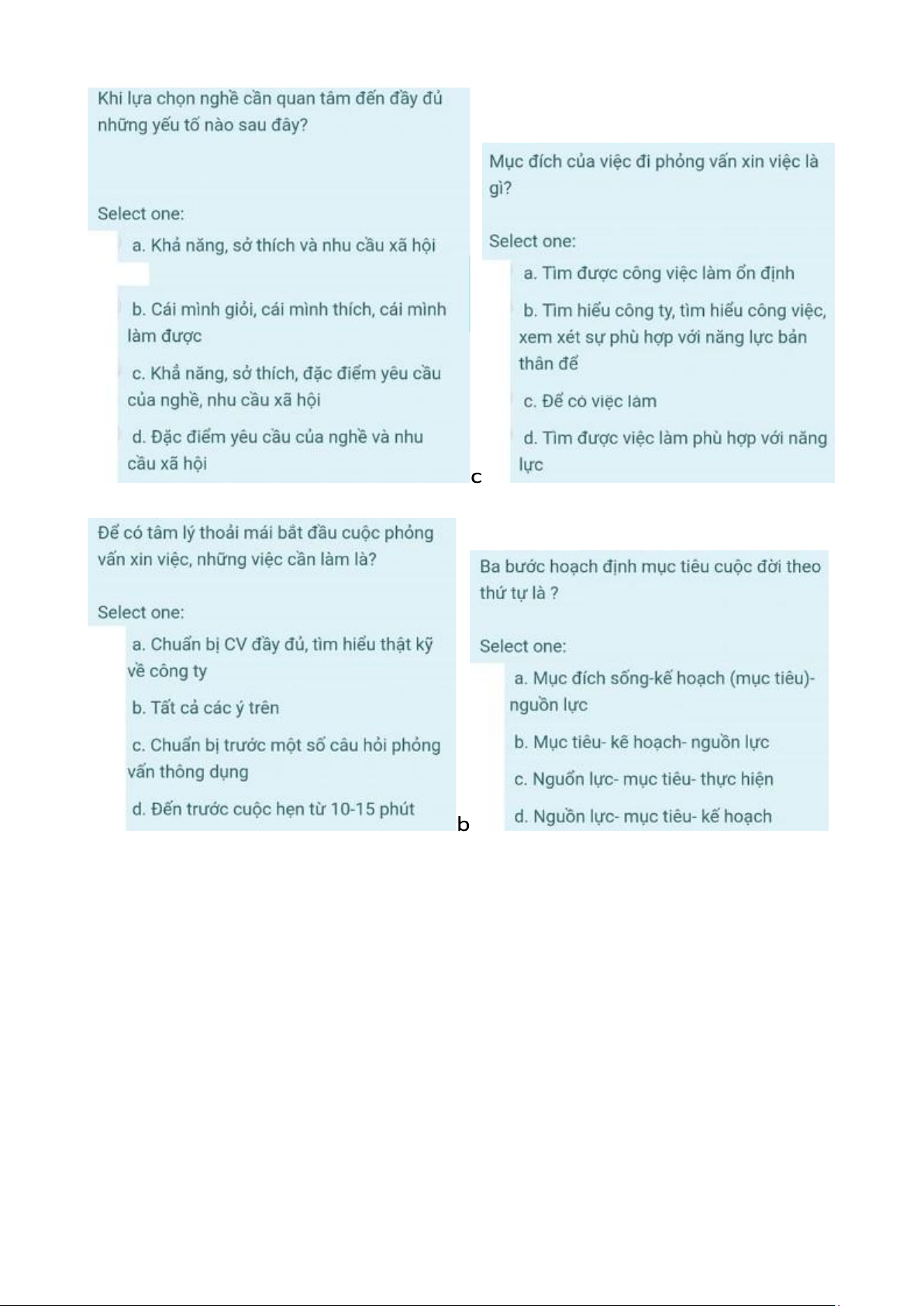 Khi lựa chọn nghề cần quan tâm đến đầy đủ những yếu tố nào sau đây? Select one: