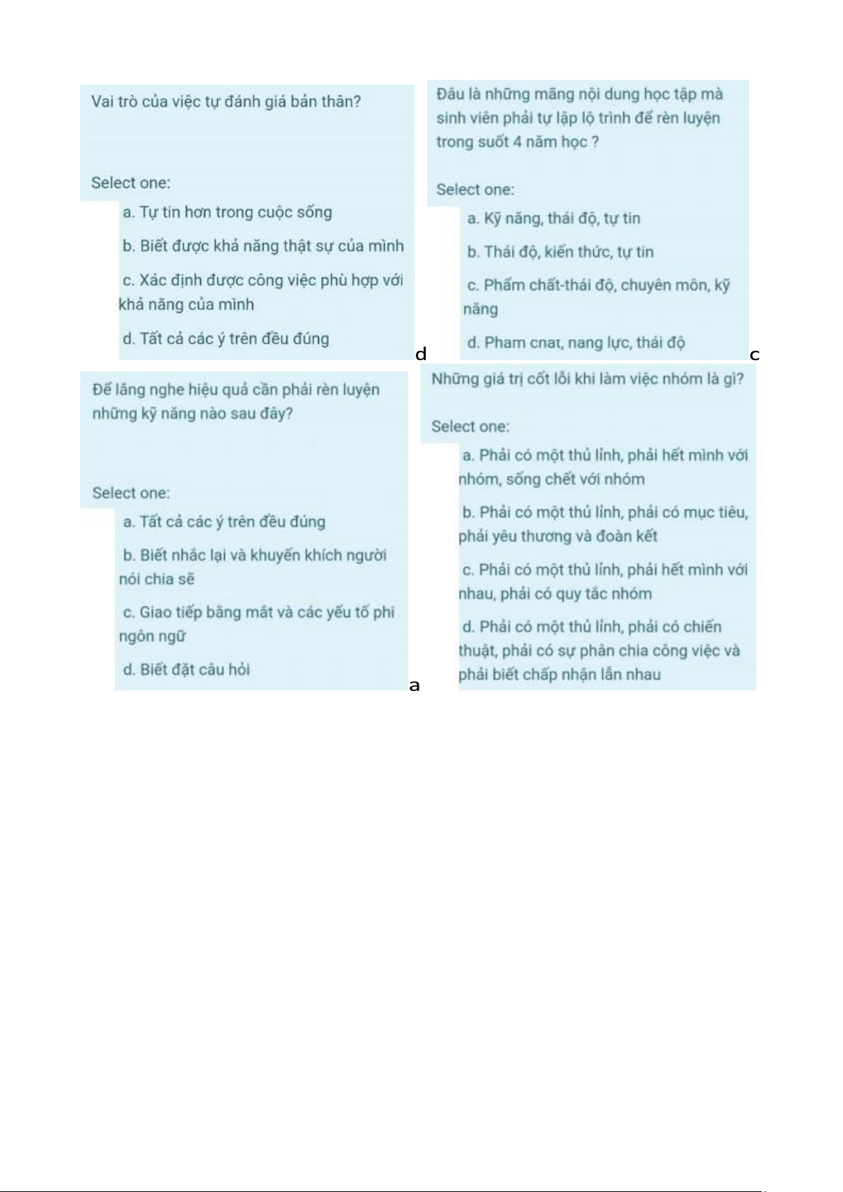 Để lắng nghe hiệu quả cần phải rèn luyện những kỹ năng nào sau đây? Select one: a. Biết đặt câu hỏi