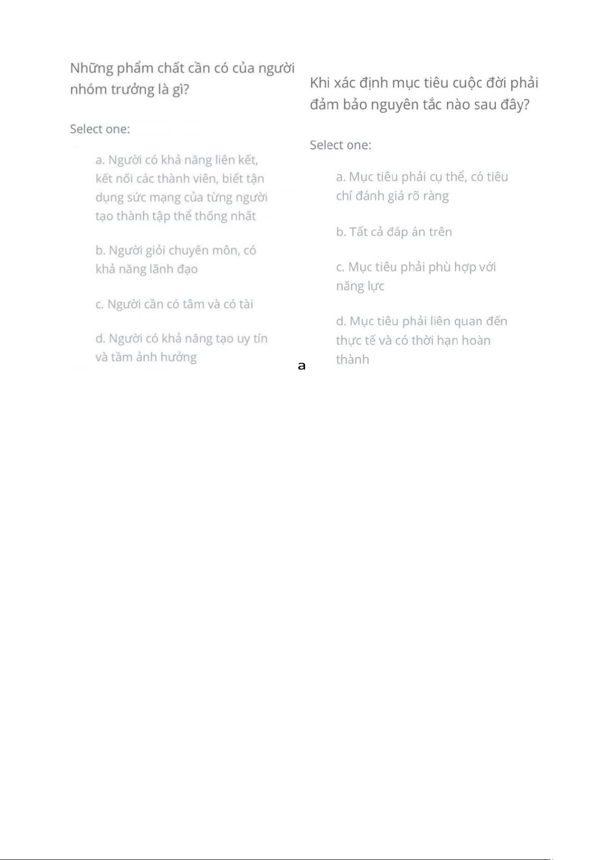 d. Có nhóm trưởng, mục tiêu, kế hoạch và nội quy Question 31 Correct Marked out of 0.25 Flag question Question text