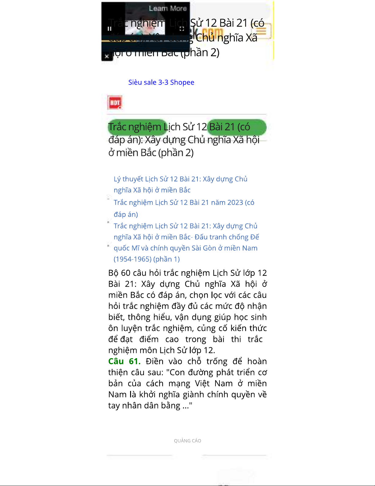 Trắc nghiệm Lịch Sử 12 Bài 21 (có đáp án): Xây dựng Chủ nghĩa Xã hội ở miền Bắc