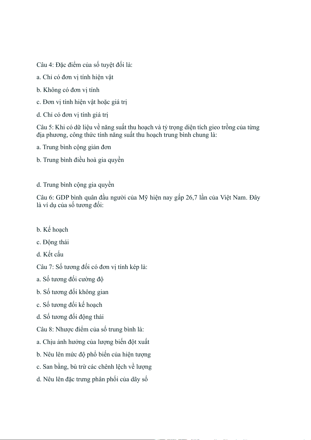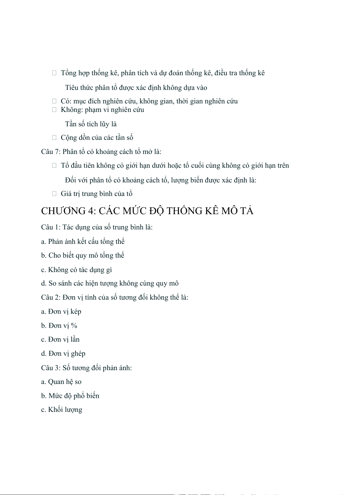 Câu 3: Số tương đối phản ánh: a. Quan hệ so b. Mức độ phổ biến c. Khối lượng