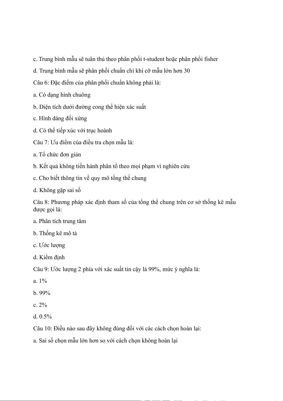 Câu 6: Đặc điểm của phân phối chuẩn không phải là: a. Có dạng hình chuông