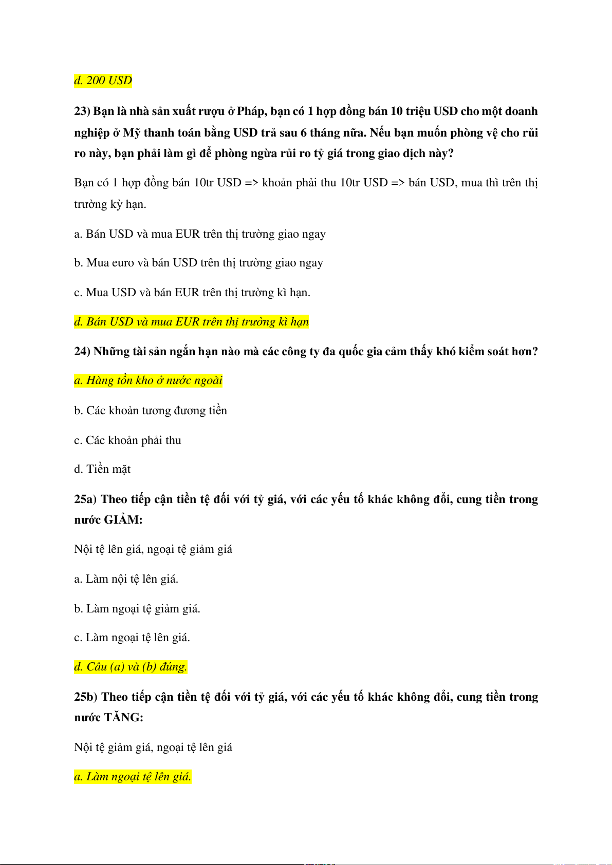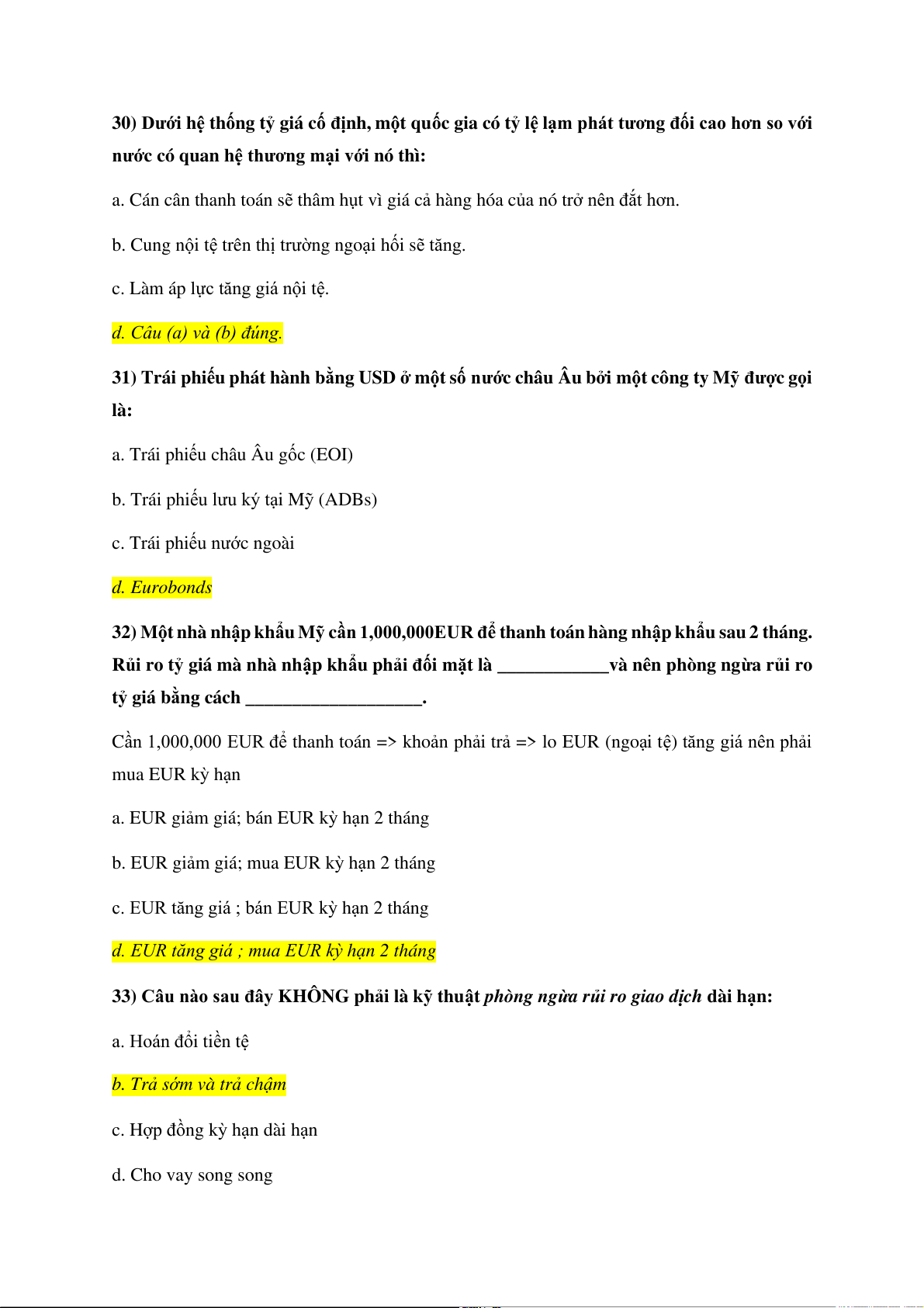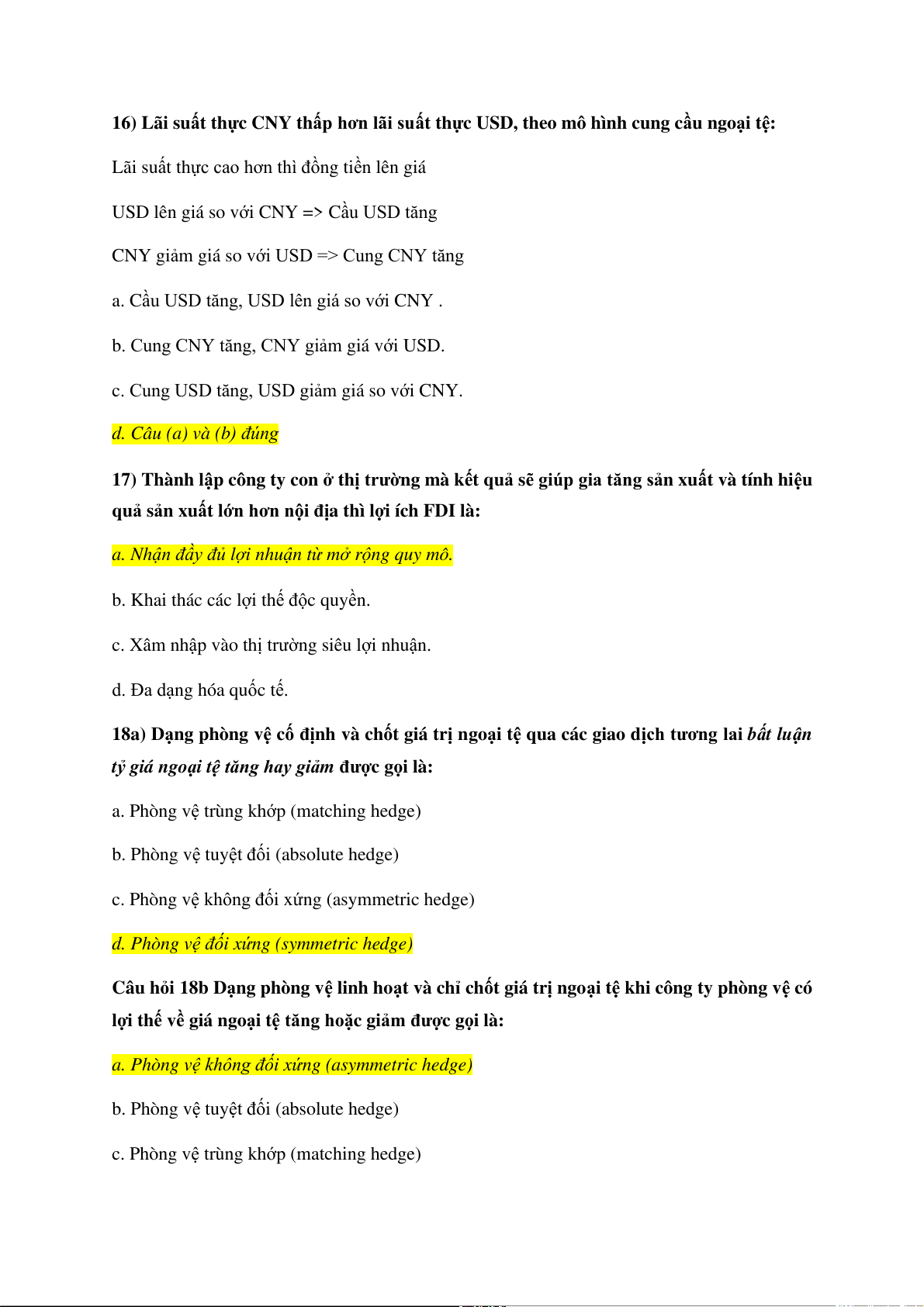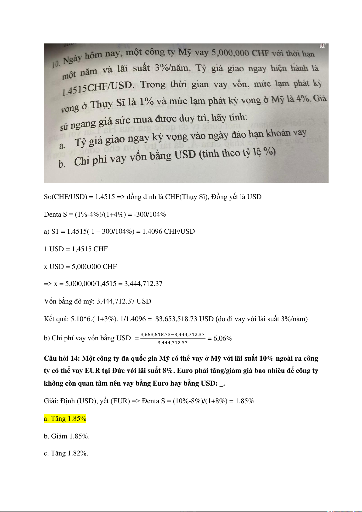 Giải: Đnh (USD), yt (EUR) => Đenta S = (10%-8%)/(1+8%) = 1.85% a. Giảm 1.85% b. Giảm 1.82% c. Tăng 1.85% d. Tăng 1.82% Câu h i
