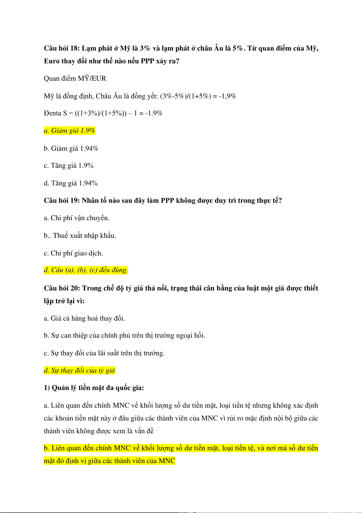 Giải: Đnh (USD), yt (EUR) => Đenta S = (10%-8%)/(1+8%) = 1.85% a. Tăng 1.85% b. Giảm 1.85%. c. Tăng 1.82%. d. Giảm 1.82%. Một MNC - M