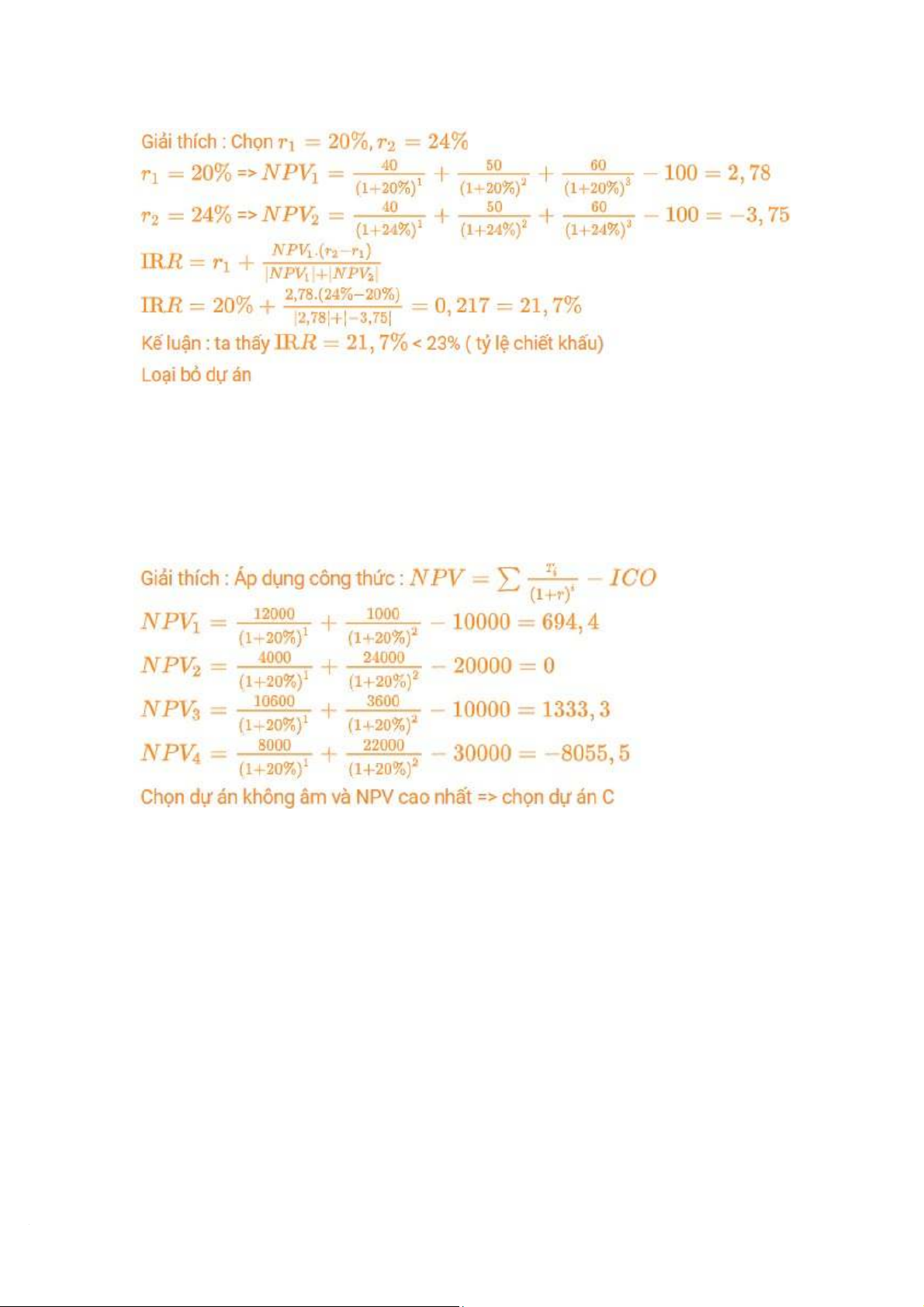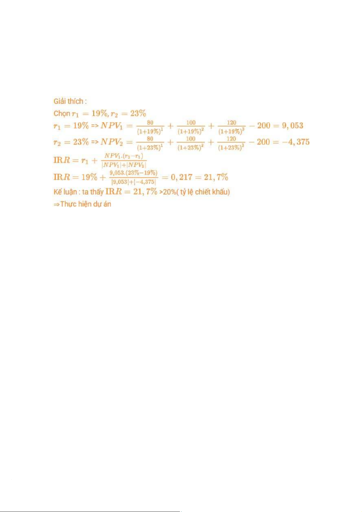 => Không thực hiện, vì IRR < tỷ lệ chiết khấu