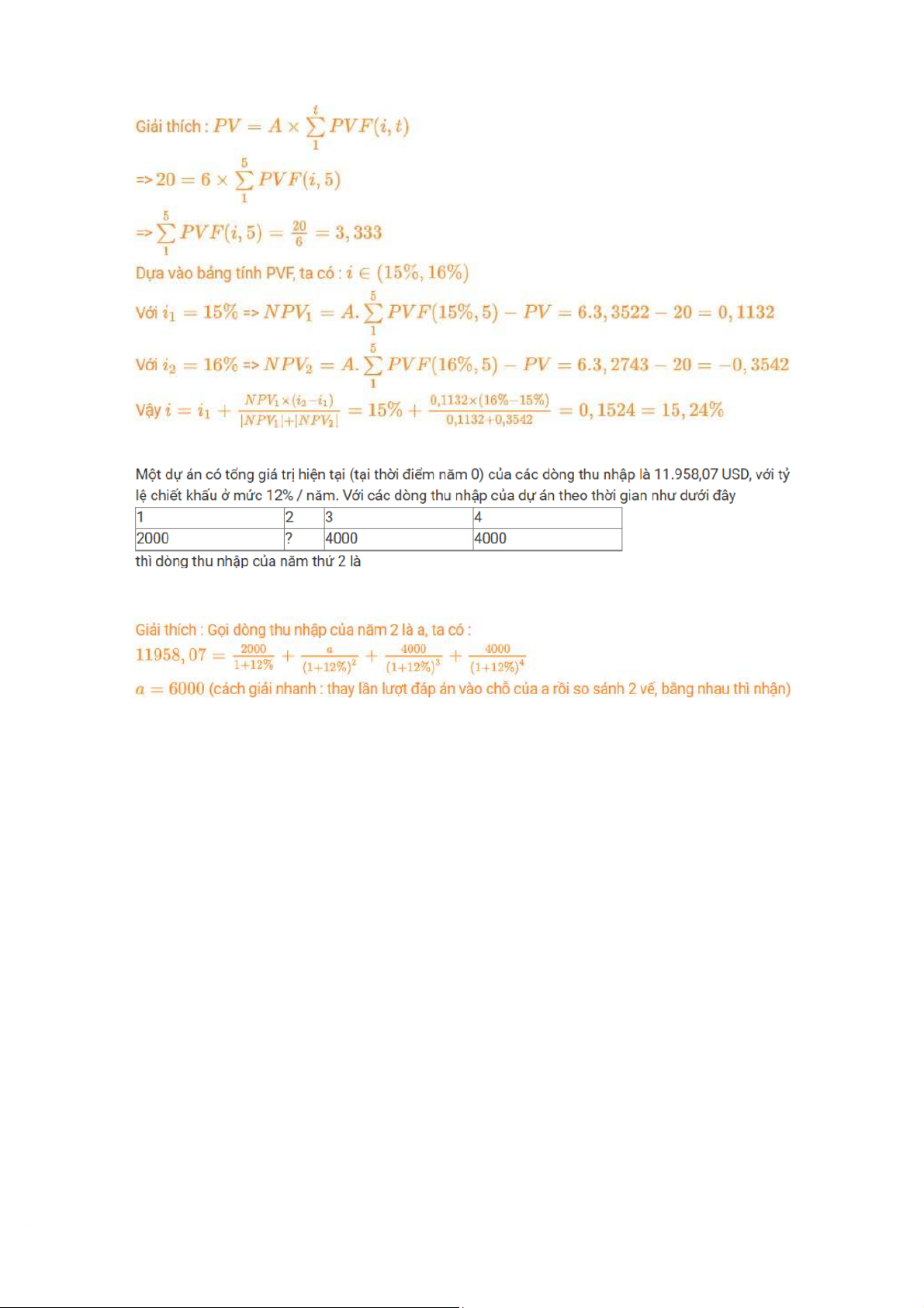 tương ứng là 40; 50 và 60 (triệu đồng). Nếu sử dụng phương pháp tỷ suất sinh lợi nội
