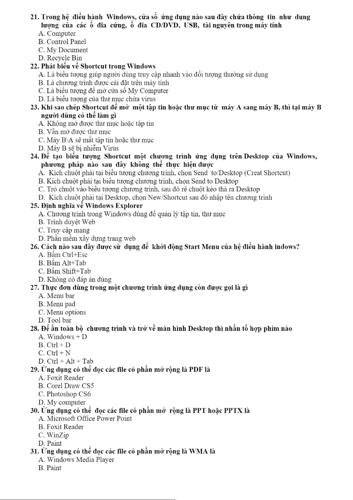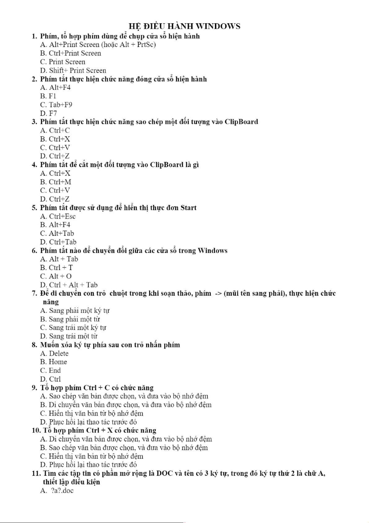 Tổ hợp phím dùng để chụp cửa sổ hiện hành. Phím tắt thực hiện chức năng đóng cửa sổ hiện hành. Phím tắt thực hiện chức năng sao chép đối tượng vào clipboard. Phím tắt dùng để cắt nội dung vào clipboard là gì. Phím tắt được sử dụng để hiển thị thực đơn start. Tài liệu giúp bạn tham khảo, ôn tập và đạt kết quả cao. Mời đọc đón xem!