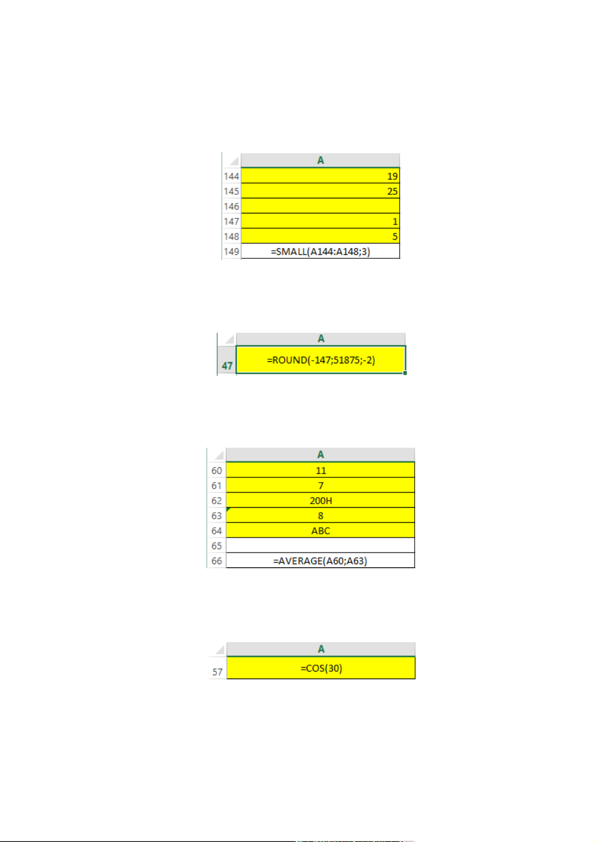 Câu 18: Trong MS Excel 2010, công thức tại ô A57 có chức năng gì? A. Tính Cosin góc 30radian B. Báo lỗi
