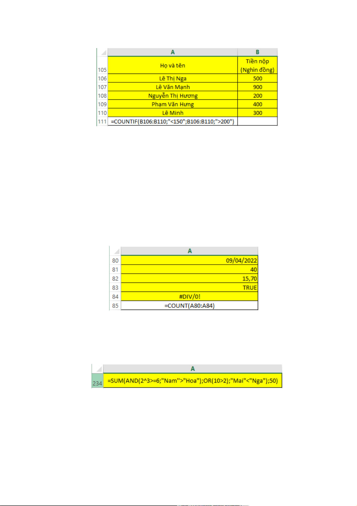 B. Đếm những người có tiền nộp nhỏ hơn 150 nghìn đồng hoặc có tiền nộp lớn hơn 200 nghìn đồng C. Báo lỗi