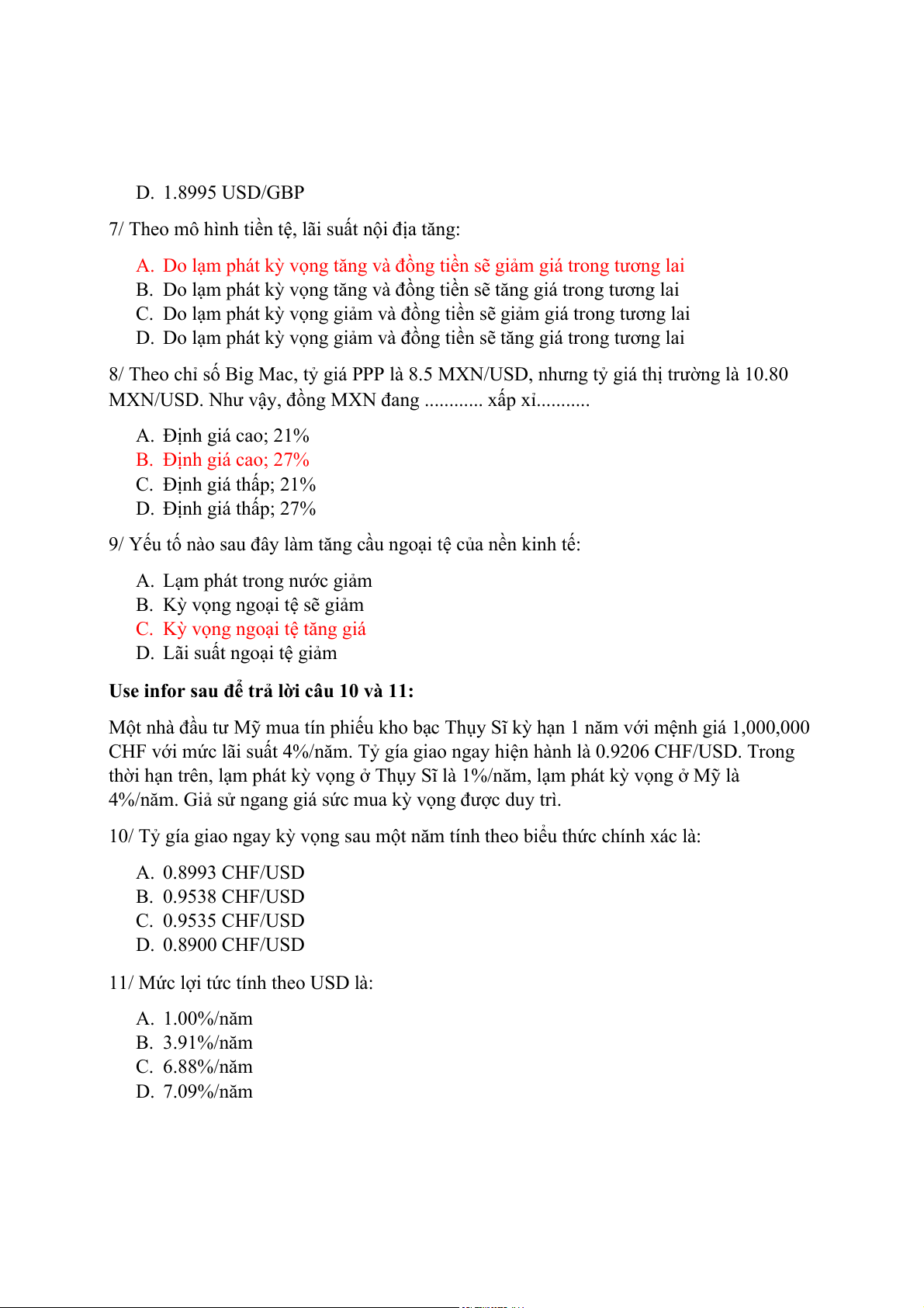 10/ Tỷ gía giao ngay kỳ vọng sau một năm tính theo biểu thức chính xác là: A. 0.8993 CHF/USD B. 0.9538 CHF/USD C. 0.9535 CHF/USD D. 0.8900 CHF/USD