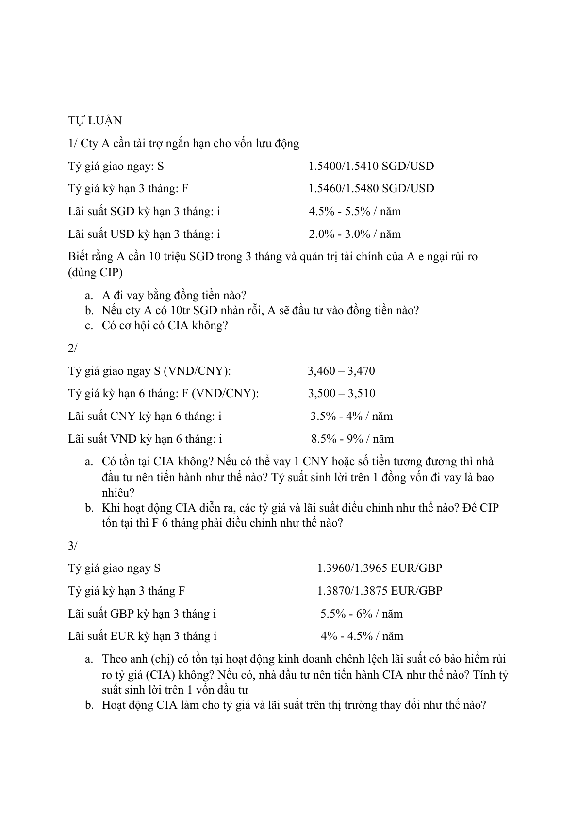 Biết rằng A cần 10 triệu SGD trong 3 tháng và quản trị tài chính của A e ngại rủi ro (dùng CIP)