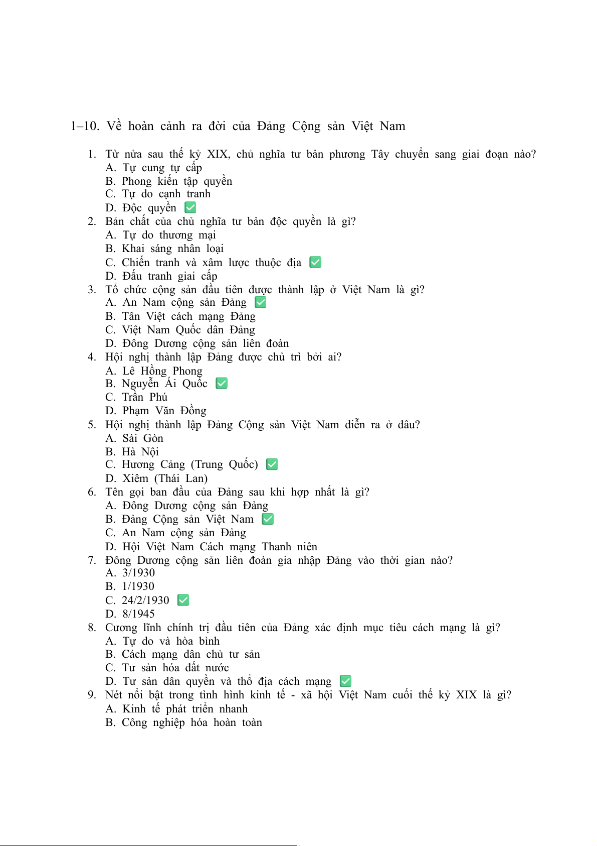 4. Hội nghị thành lập Đảng được chủ trì bởi ai? A. Lê Hồng Phong B. Nguyễn Ái Quốc ✅ C. Trần Phú D. Phạm Văn Đồng