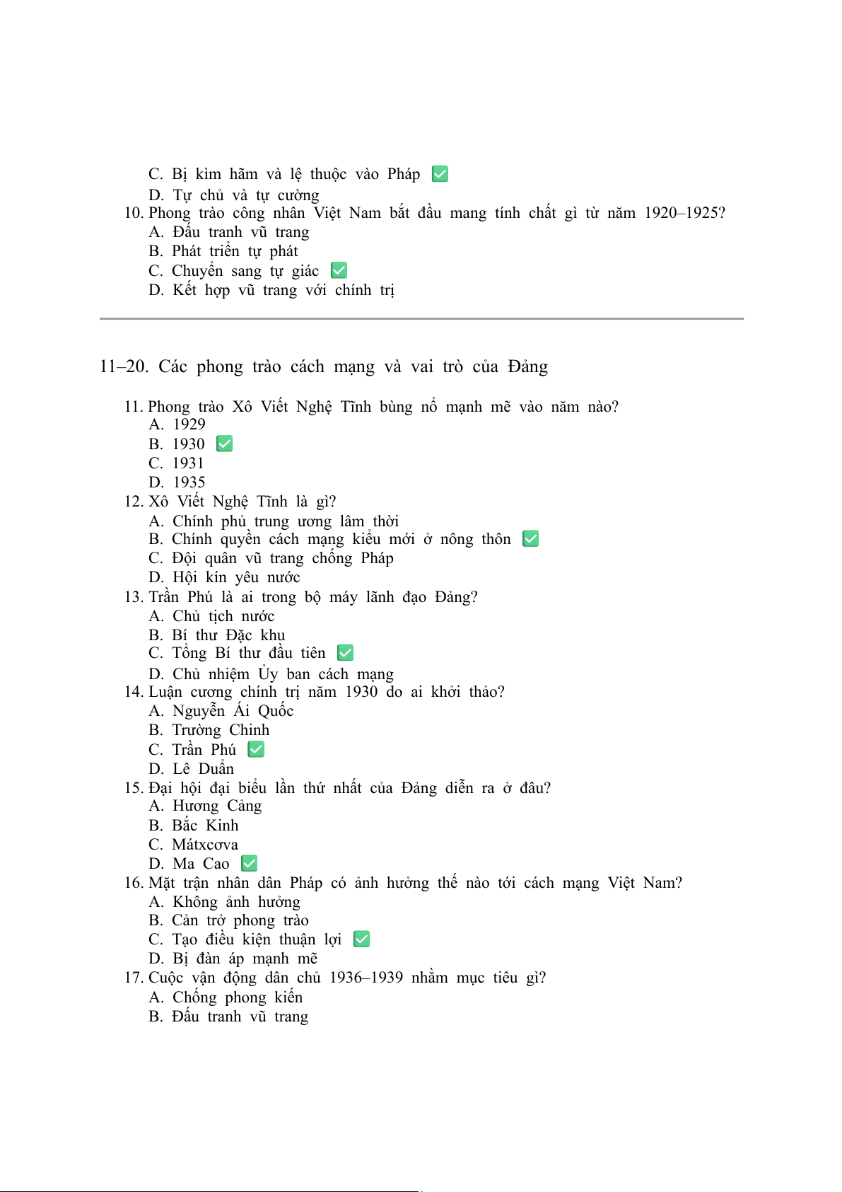 14. Luận cương chính trị năm 1930 do ai khởi thảo? A. Nguyễn Ái Quốc B. Trường Chinh C. Trần Phú ✅ D. Lê Duẩn