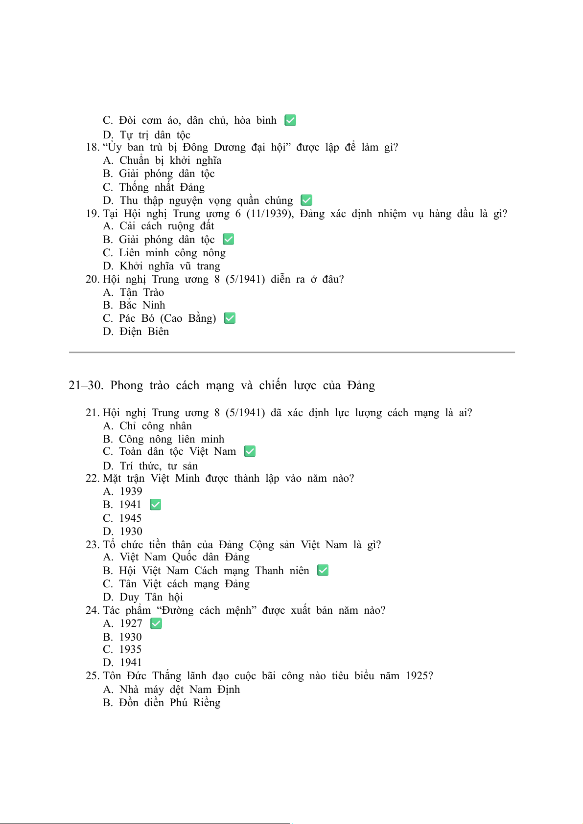 22. Mặt trận Việt Minh được thành lập vào năm nào? A. 1939 B. 1941 ✅ C. 1945 D. 1930