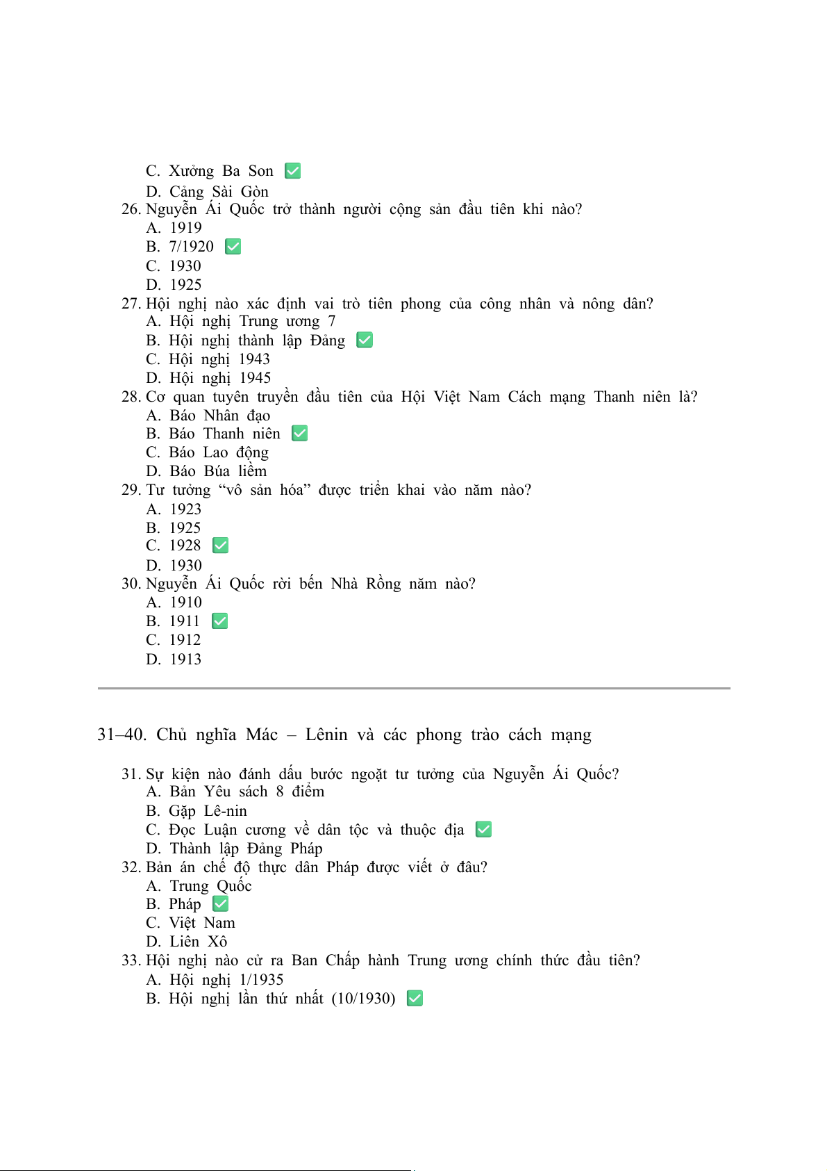 30. Nguyễn Ái Quốc rời bến Nhà Rồng năm nào? A. 1910 B. 1911 ✅ C. 1912 D. 1913