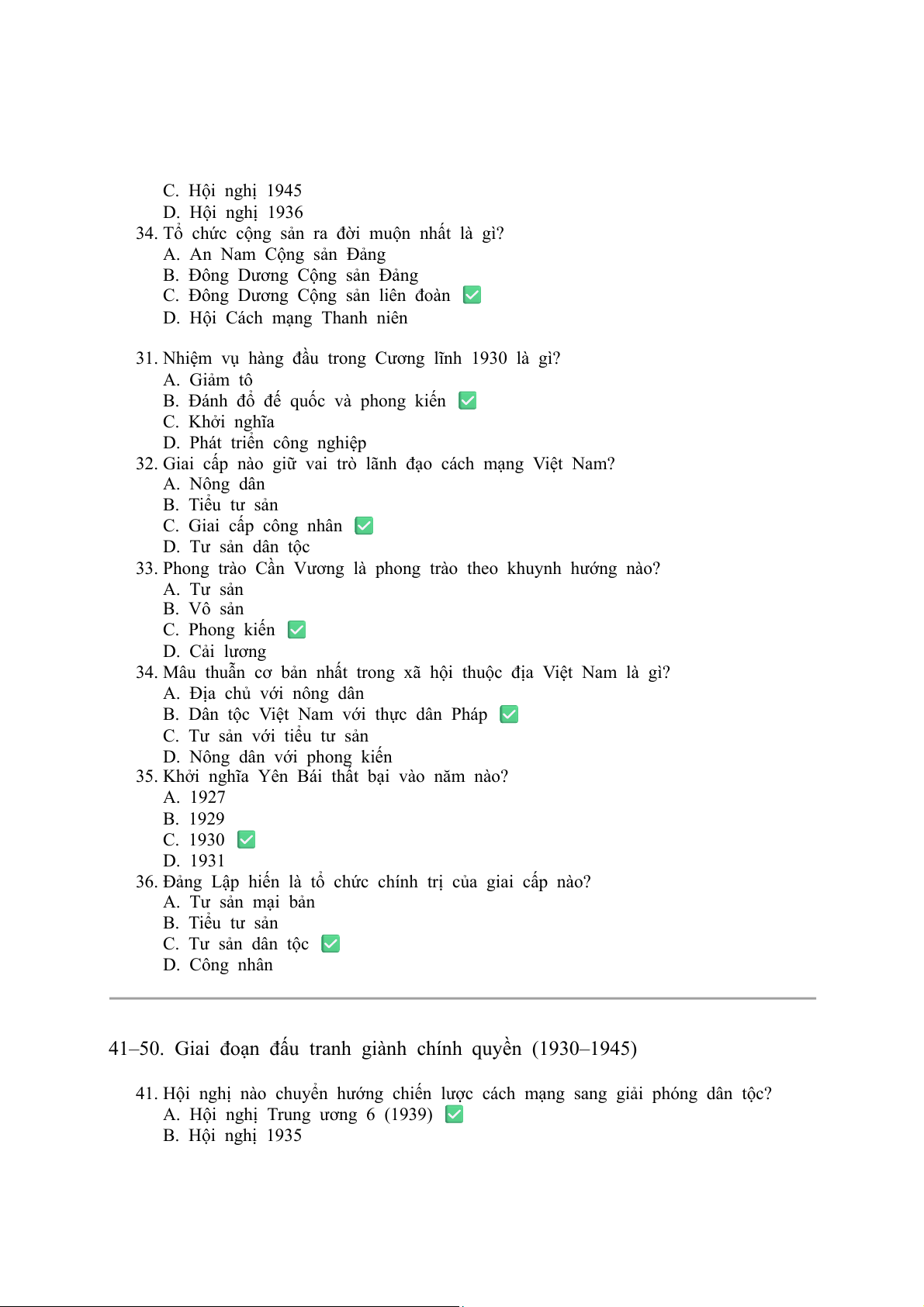 35. Khởi nghĩa Yên Bái thất bại vào năm nào? A. 1927 B. 1929 C. 1930 ✅ D. 1931