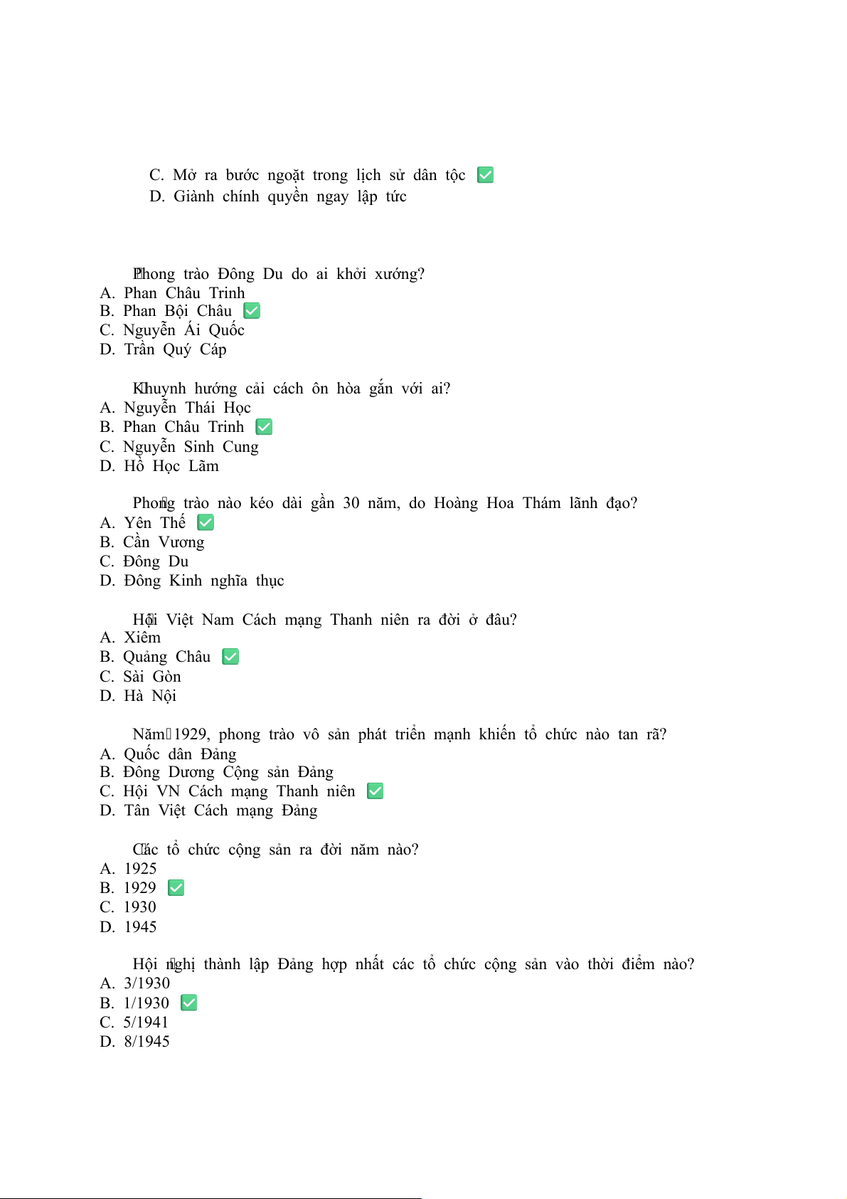 1. Phong trào Xô Viết Nghệ Tĩnh bùng nổ mạnh mẽ vào năm nào? A. 1929 B. 1930 ✅ C. 1931 D. 1935