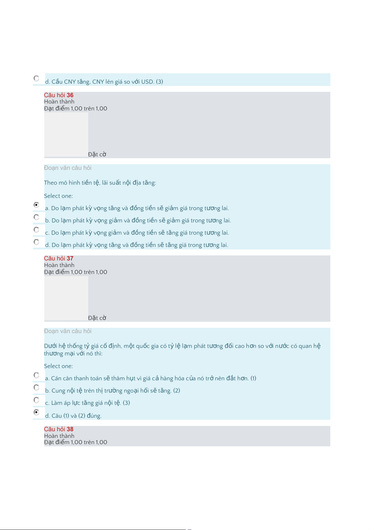 LãisuấtthựcCNYcaohơnlãisuấtthựcUSD,theomôhìnhcungcầungoạitệ: Select one: a."Cung USD t n ă g, USD gi m ả giá so v i ớ CNY. (2) b."Câu (2) và (3) ú đ ng c."C u ầ USD t n ă g, USD lên giá so v i ớ CNY. (1) d."C u ầ CNY t n ă g, CNY lên giá so v i ớ USD. (3) Câu hỏi 36 Hoàn thành Đ t ạ i đ m ể 1,00 trên 1,00 Đ t ặ cờ Đoạn văn câu hỏi Theo mô hình ti n ề t , ệ lãi su t ấ n i ộ a đị t n ă g: Select one: a."Do l m ạ phát k ỳ v n ọ g t n ă g và n đồ g ti n ề s ẽ gi m ả giá trong t n ươ g lai. b."Do l m ạ phát k ỳ v n ọ g gi m ả và n đồ g ti n ề s ẽ gi m ả giá trong t n ươ g lai. c."Do l m ạ phát k ỳ v n ọ g gi m ả và n