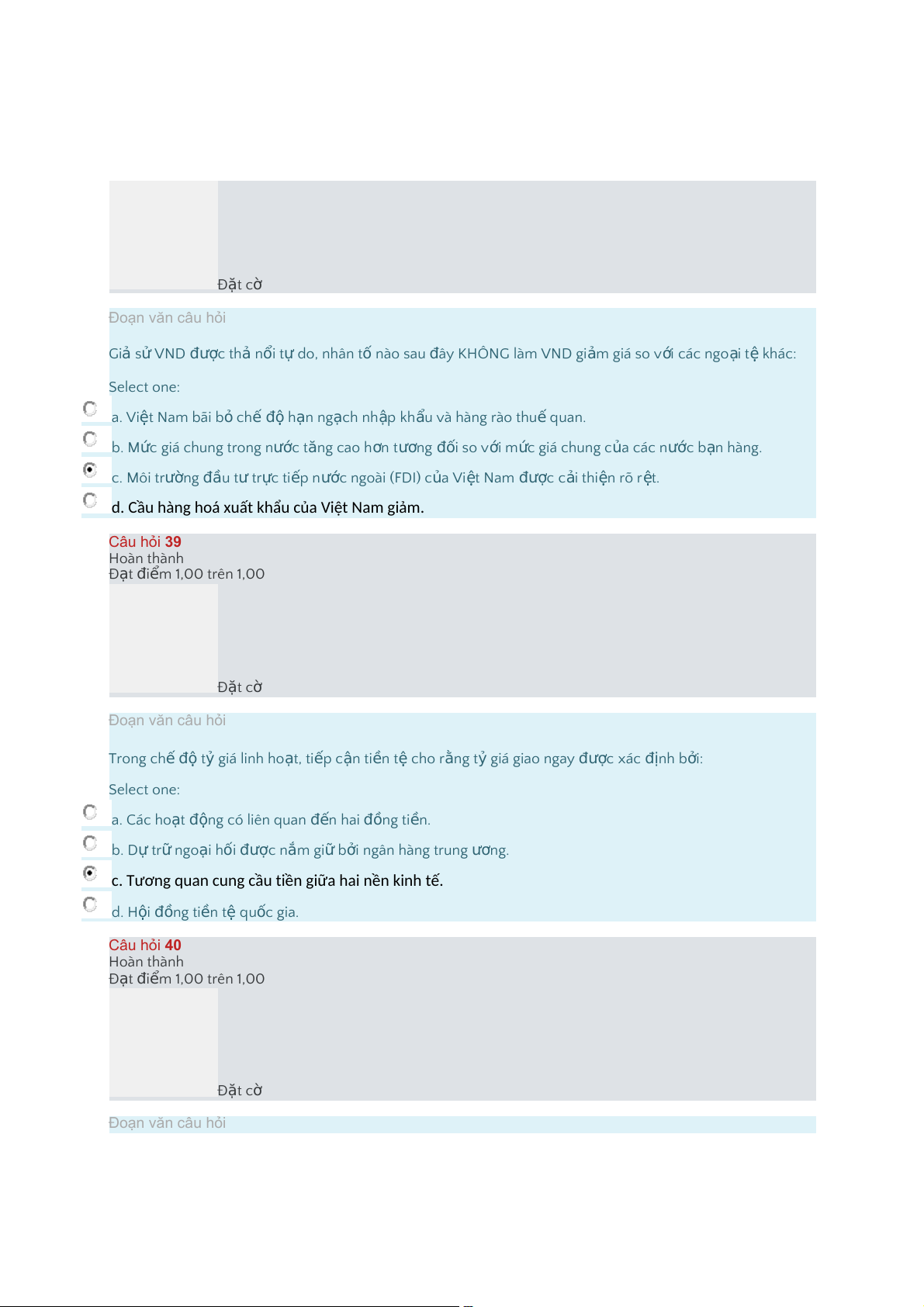 d.CầuhànghoáxuấtkhẩucủaViệtNamgiảm. Câu hỏi 39 Hoàn thành Đ t ạ i đ m ể 1,00 trên 1,00 Đ t ặ cờ Đoạn văn câu hỏi Trong chế độ t ỷ giá linh ho t ạ , ti p ế c n ậ ti n ề t ệ cho r n ằ g t ỷ giá giao ngay c đượ xác n đị h b i ở : Select one: a."Các ho t ạ n độ g có liên quan n đế hai n đồ g ti n ề . b."Dự tr ữ ngo i