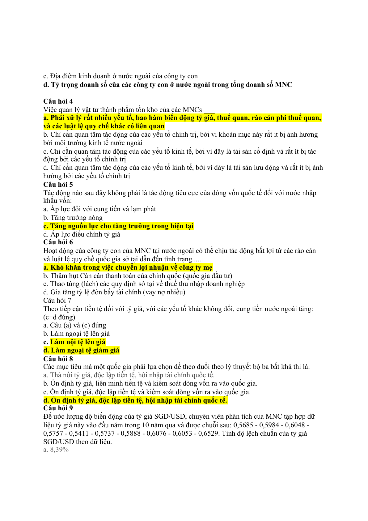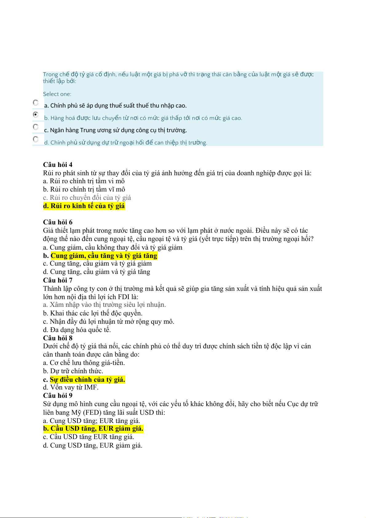 d. Ổn định tỷ giá, độc lập tiền tệ, hội nhập tài chính quốc tế. Câu hỏi 9