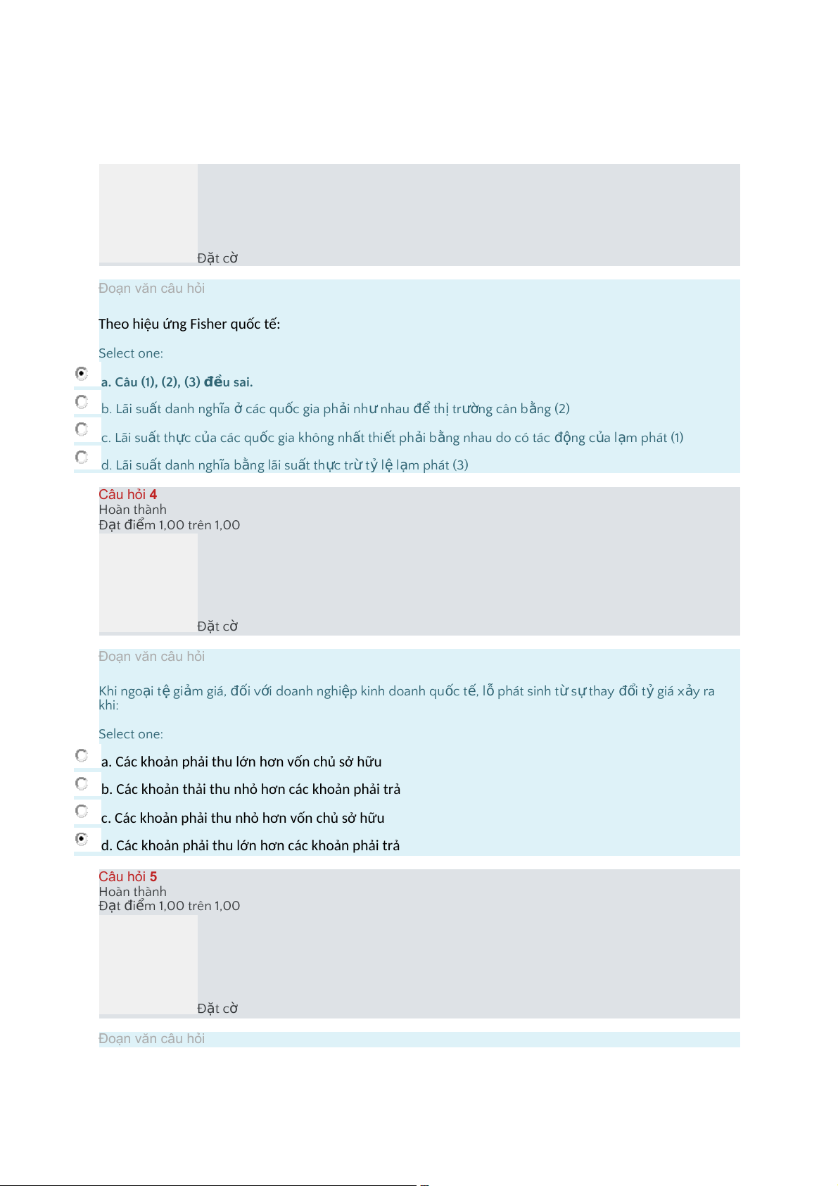 a.Câu (1), (2), (3) u đề sai. b."Lãi su t ấ danh ngh a ĩ ở các qu c ố gia ph i ả nh ư nhau để th ịtr n ườ g cân b n ằ g (2) c."Lãi su t ấ th c ự của các qu c ố gia không nh t ấ thi t ế ph i ả b n ằ g nhau do có tác n độ g c a ủ l m ạ phát (1) d."Lãi su t ấ danh ngh a ĩ b n ằ g lãi su t ấ th c ự trừ t ỷ l ệ l m ạ phát (3) Câu hỏi 4 Hoàn thành Đ t ạ i đ m ể 1,00 trên 1,00 Đ t ặ cờ Đoạn văn câu hỏi Khi ngo i ạ t ệ gi m ả giá, đối v i ớ doanh nghi p ệ kinh doanh qu c ố t , ế l ỗ phát sinh t ừ s ự thay i đổ t ỷ giá x y ả ra khi: Select one: