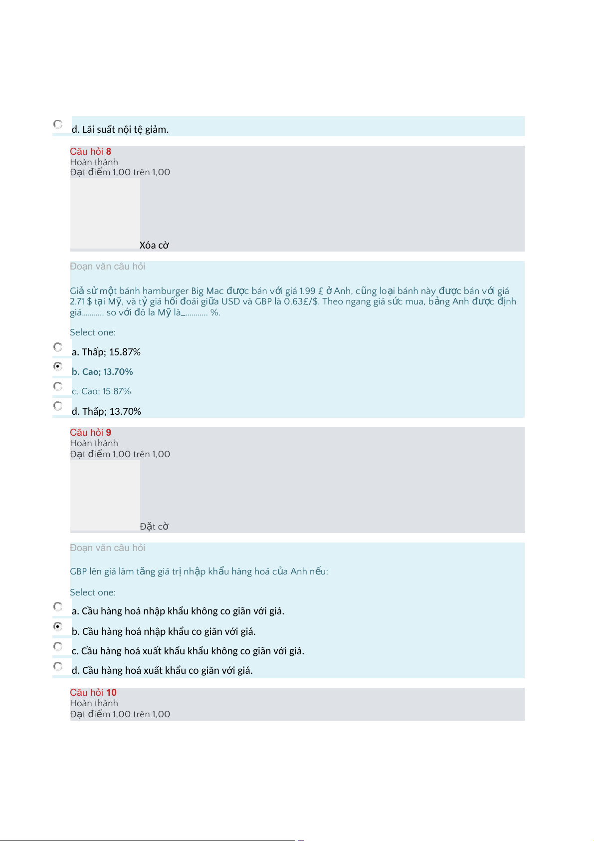 d.Lãisuấtnộitệgiảm. Câu hỏi 8 Hoàn thành Đ t ạ i đ m ể 1,00 trên 1,00 Xóacờ Đoạn văn câu hỏi Gi ả s ử m t ộ bánh hamburger Big Mac c đượ bán v i ớ giá 1.99 £ ở Anh, c n ũ g lo i ạ bánh này c đượ bán v i ớ giá 2.71 $ tại M , ỹ và t ỷ giá h i ố o đ ái gi a