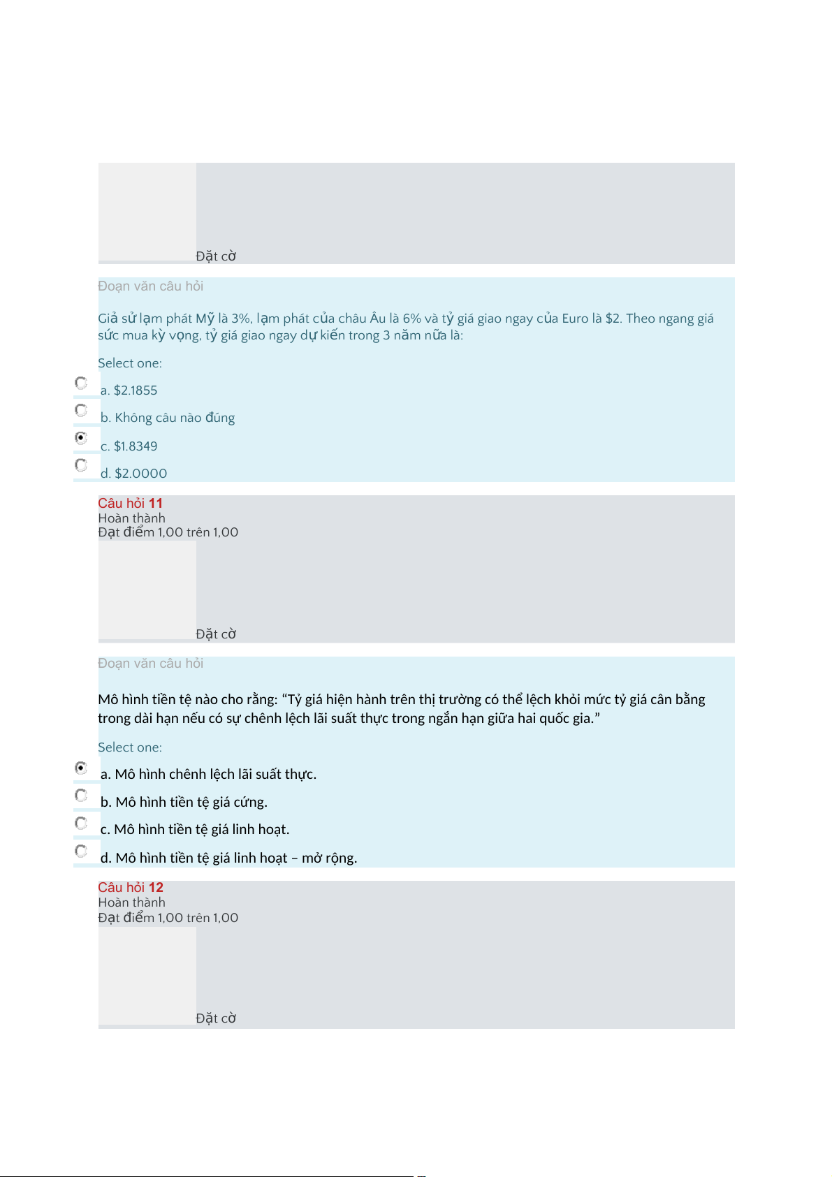 đồ g tiền sẽ tăng giá trong t n ươ g lai. d."Do l m ạ phát k ỳ v n ọ g t n ă g và n đồ g ti n ề s ẽ t n ă g giá trong t n ươ g lai. Câu hỏi 37 Hoàn thành Đ t ạ i đ m ể 1,00 trên 1,00 Đ t ặ cờ Đoạn văn câu hỏi D i ướ h ệ th n ố g t ỷ giá c ố n đị h, m t ộ qu c ố gia có t ỷ l ệ l m ạ phát t n ươ g i đố cao h n ơ so v i ớ n c ướ có quan h ệ th n ươ g m i ạ v i ớ nó thì: Select one: a."Cán cân thanh toán s ẽ thâm h t ụ vì giá c ả hàng hóa c a ủ nó tr ở nên t đắ h n ơ . (1) b."Cung n i ộ tệ trên th ịtr n ườ g ngo i ạ h i ố s ẽ t n ă g. (2) c."Làm áp l c ự tăng giá n i ộ t . ệ (3) d."Câu (1) và (2) ú đ ng. Câu hỏi 38 Hoàn thành Đ t ạ i đ m ể 1,00 trên 1,00 Đ t ặ cờ Đoạn văn câu hỏi Giả sử VND c đượ thả n i