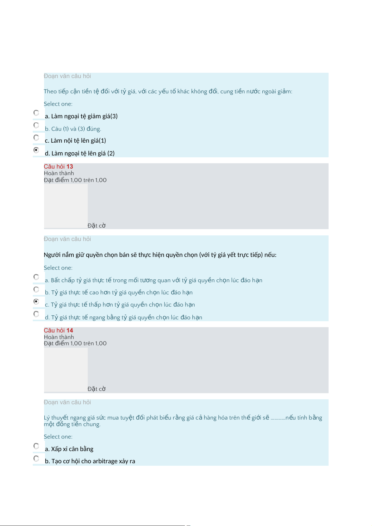 Ngườinắmgiữquyềnchọnbánsẽthựchiệnquyềnchọn(vớitỷgiáyếttrựctiếp)nếu: Select one: a."B t ấ ch p ấ t ỷ giá th c ự t ế trong m i ố t n ươ g quan v i ớ t ỷ giá quyền ch n ọ lúc á đ o h n ạ b."T ỷ giá th c ự t ế cao h n ơ t ỷ giá quy n ề ch n ọ lúc á đ o h n ạ c."T ỷ giá th c ự t ế th p ấ h n ơ t ỷ giá quy n ề ch n ọ lúc á đ o h n ạ d."T ỷ giá th c ự t ế ngang b n ằ g tỷ giá quy n ề ch n ọ lúc á đ o h n ạ Câu hỏi 14 Hoàn thành Đ t ạ i đ m ể 1,00 trên 1,00 Đ t ặ cờ Đoạn văn câu hỏi Lý thuy t ế ngang giá s c ứ mua tuy t ệ i đố phát bi u ể r n ằ g giá c ả hàng hóa trên th ế gi i ớ s ẽ …………n u ế tính b n ằ g m t ộ n đồ g ti n ề chung. Select one: