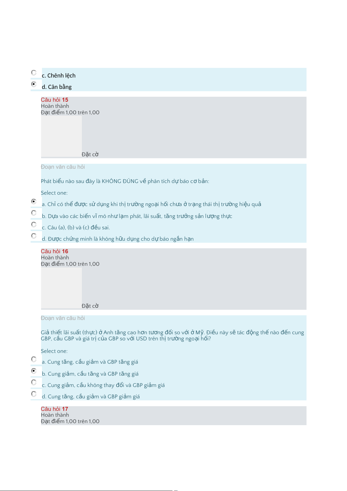 b.Tạocơhộichoarbitragexảyra c.Chênhlệch d.Cânbằng Câu hỏi 15 Hoàn thành Đ t ạ i đ m ể 1,00 trên 1,00 Đ t ặ cờ Đoạn văn câu hỏi Phát bi u ể nào sau â đ y là KHÔNG ĐÚNG v ề phân tích d ự báo c ơ b n ả : Select one: a."Chỉ có th ể c đượ sử d n ụ g khi th ịtr n ườ g ngo i ạ h i ố ch a ư ở tr n ạ g thái th ịtrư n ờ g hi u ệ quả b."D a ự vào các bi n ế v ĩmô nh ư l m ạ phát, lãi su t ấ , t n ă g tr n ưở g s n ả l n ượ g th c ự c."Câu (a), (b) và (c) u đề sai. d."Được ch n ứ g minh là không h u ữ d n ụ g cho d ự báo ng n ắ h n ạ Câu hỏi 16 Hoàn thành Đ t ạ i đ m ể 1,00 trên 1,00 Đ t ặ cờ Đoạn văn câu hỏi Gi ả thi t ế lãi su t ấ (th c) ự ở Anh tăng cao h n ơ t n ươ g i đố so v i ớ ở M . ỹ Đi u ề này s ẽ tác n độ g th ế nào n đế cung GBP, c u ầ GBP và giá tr ịc a ủ GBP so v i ớ USD trên th ịtr n ườ g ngo i ạ h i ố ? Select one: a."Cung t n ă g, c u ầ gi m ả và GBP t n ă g giá b."Cung gi m, ả c u ầ t n ă g và GBP t n ă g giá c."Cung gi m, ả c u ầ không thay i đổ và GBP gi m ả giá d."Cung t n ă g, c u ầ gi m ả và GBP gi m ả giá Câu hỏi 17 Hoàn thành Đ t ạ i đ m ể 1,00 trên 1,00 Đ t ặ cờ Đoạn văn câu hỏi Theo Ngang giá lãi su t ấ có b o ả hi m ể CIP, i đ m ể k ỳ h n ạ g n ầ b n ằ g: Select one: a."Lãi su t ấ c a ủ đồng định giá b."T n ổ g lãi su t ấ c a ủ hai đồng ti n ề c."Chênh l ch ệ lãi su t ấ c a ủ hai n đồ g ti n ề d."Lãi su t ấ c a ủ đ n ồ g yết giá Câu hỏi 18 Hoàn thành Đ t ạ i đ m ể 1,00 trên 1,00 Đ t ặ cờ Đoạn văn câu hỏi