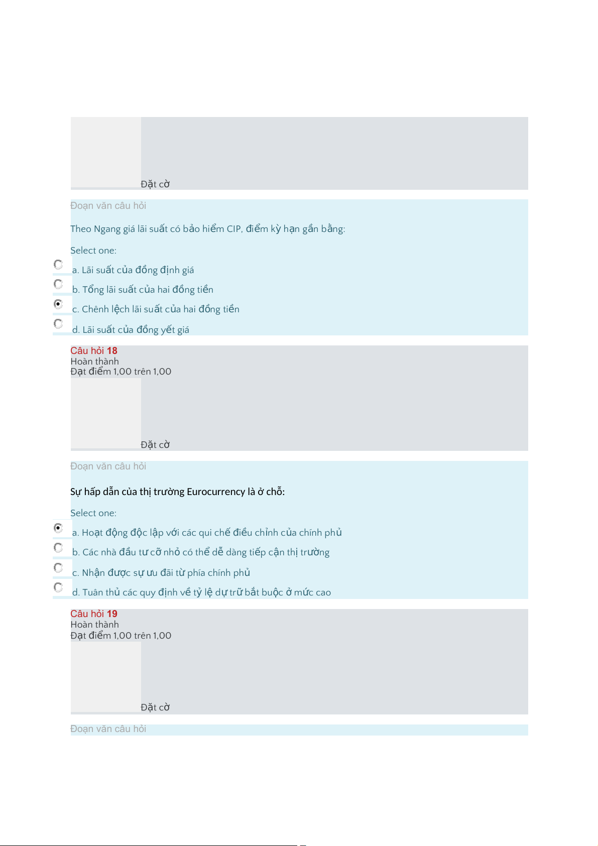 d."Tuân thủ các quy định v ề t ỷ l ệ d ự tr ữ b t ắ bu c ộ ở m c ứ cao Câu hỏi 19 Hoàn thành Đ t ạ i đ m ể 1,00 trên 1,00 Đ t ặ cờ Đoạn văn câu hỏi Trong hệ th n ố g ti n ề t _