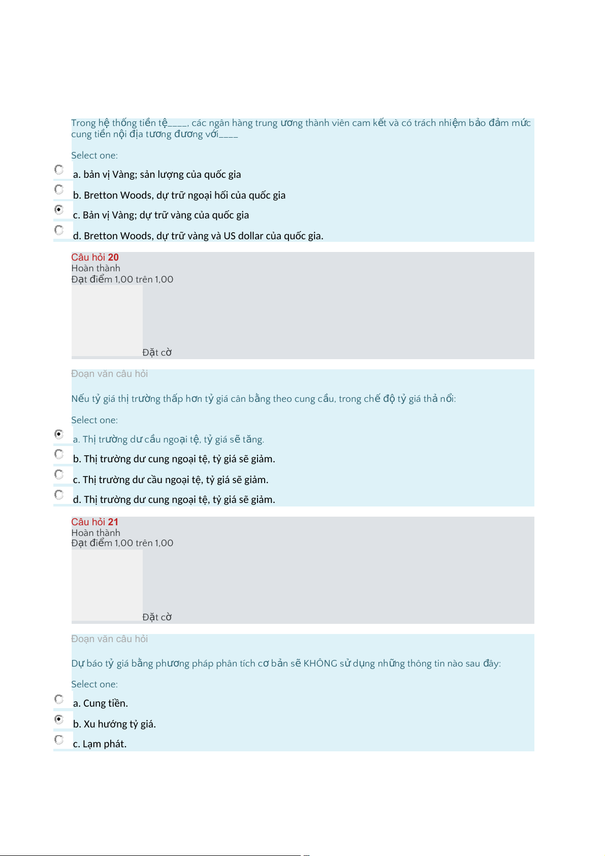 d.Thịtrườngdưcungngoạitệ,tỷgiásẽgiảm. Câu hỏi 21 Hoàn thành Đ t ạ i đ m ể 1,00 trên 1,00 Đ t ặ cờ Đoạn văn câu hỏi D ự báo tỷ giá b n ằ g ph n ươ g pháp phân tích c ơ b n ả s ẽ KHÔNG s ử d n ụ g nh n ữ g thông tin nào sau â đ y: Select one: a.Cungtiền.