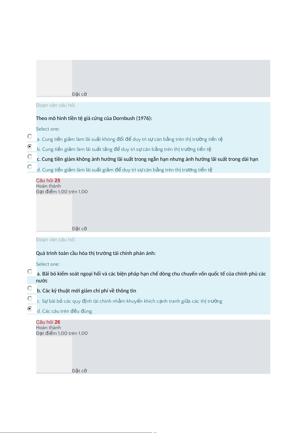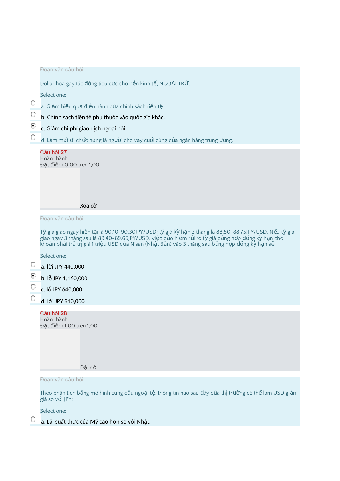 ỏ các quy định tài chính nh m ằ khuy n ế khích c n ạ h tranh gi a ữ các th ịtr n ườ g d."Các câu trên đều ú đ ng. Câu hỏi 26 Hoàn thành Đ t ạ i đ m ể 1,00 trên 1,00 Đ t ặ cờ Đoạn văn câu hỏi Dollar hóa gây tác n độ g tiêu c c ự cho n n ề kinh tế, NGO I Ạ TR : Ừ Select one: a."Gi m ả hiệu qu ả i đ u