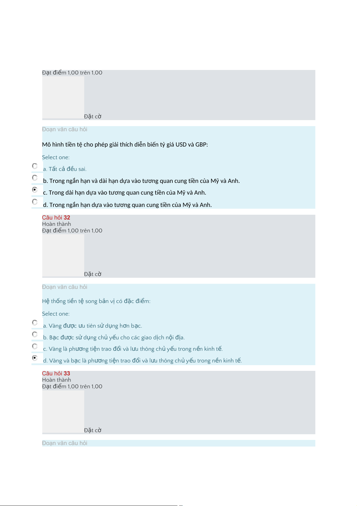 d.TrongngắnhạndựavàotươngquancungtiềncủaMỹvàAnh. Câu hỏi 32 Hoàn thành Đ t ạ i đ m ể 1,00 trên 1,00 Đ t ặ cờ Đoạn văn câu hỏi Hệ th n ố g ti n ề t ệ song b n ả v ịcó c đặ đi m: ể Select one: a."Vàng c đượ u ư tiên s ử d n ụ g h n ơ b c. ạ b."B c ạ c đượ sử d n ụ g ch ủ y u ế cho các giao d ch ị n i ộ a đị . c."Vàng là ph n ươ g ti n ệ trao i đổ và l u ư thông ch ủ y u ế trong n n ề kinh t . ế d."Vàng và b c ạ là ph n ươ g ti n ệ trao i đổ và l u ư thông ch ủ y u ế trong n n ề kinh t . ế Câu hỏi 33 Hoàn thành Đ t ạ i đ m ể 1,00 trên 1,00 Đ t ặ cờ Đoạn văn câu hỏi Thị tr n