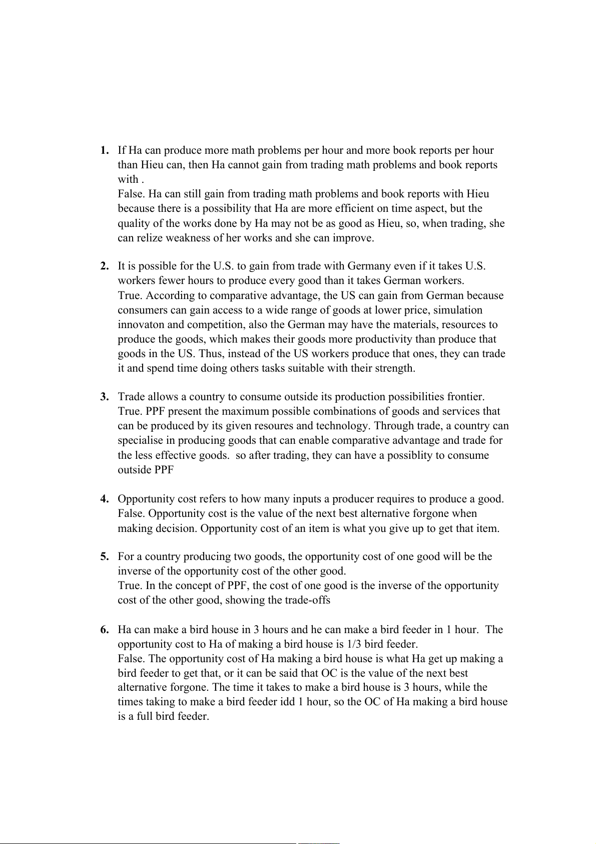 False. The opportunity cost of Ha making a bird house is what Ha get up making a