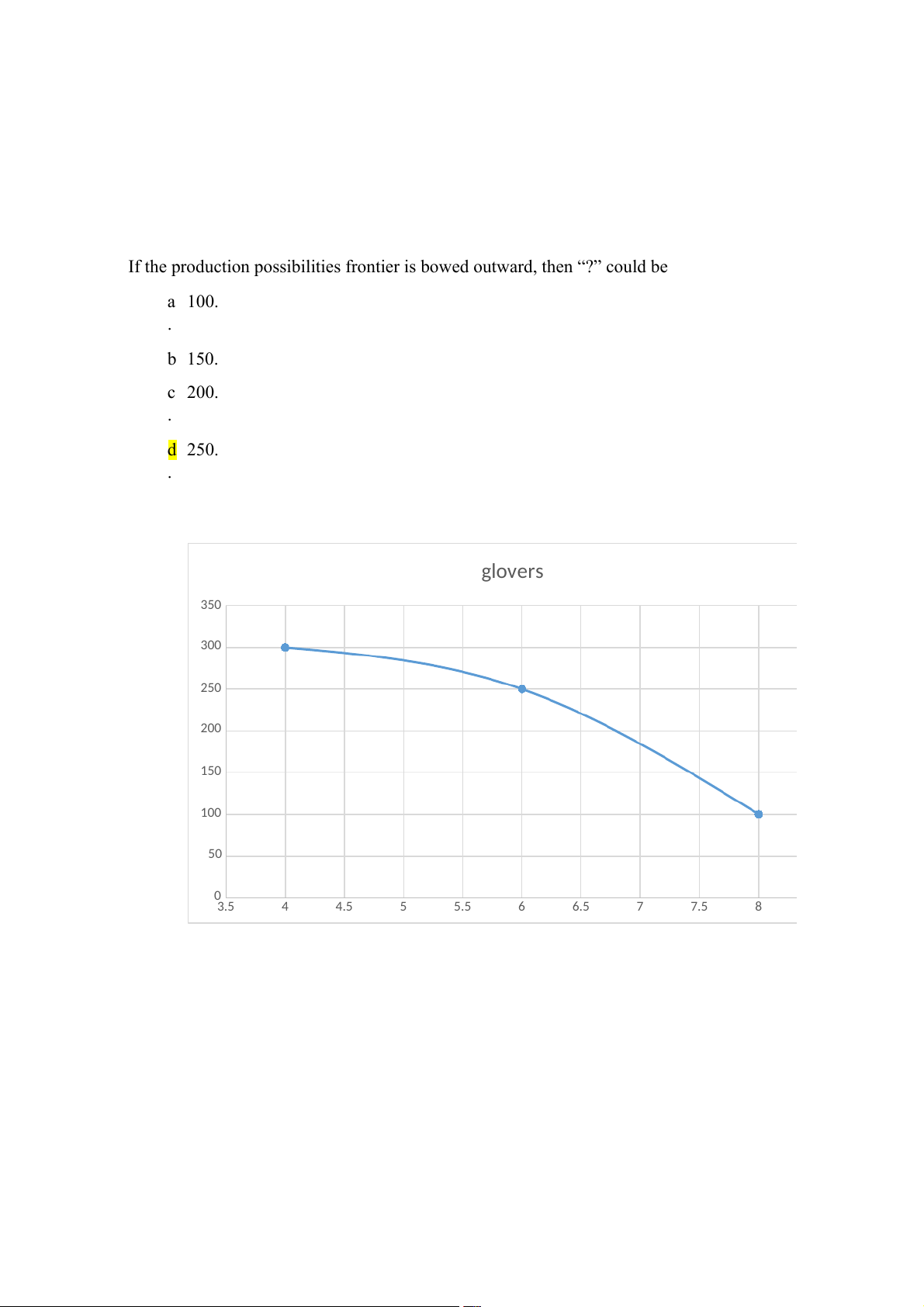 If the production possibilities frontier is bowed outward, then “?” could be a 100. . b 150. c 200. . d 250. . glovers 350 300 250 200 150 100 50 03.5 4 4.5 5 5.5 6 6.5 7 7.5 8